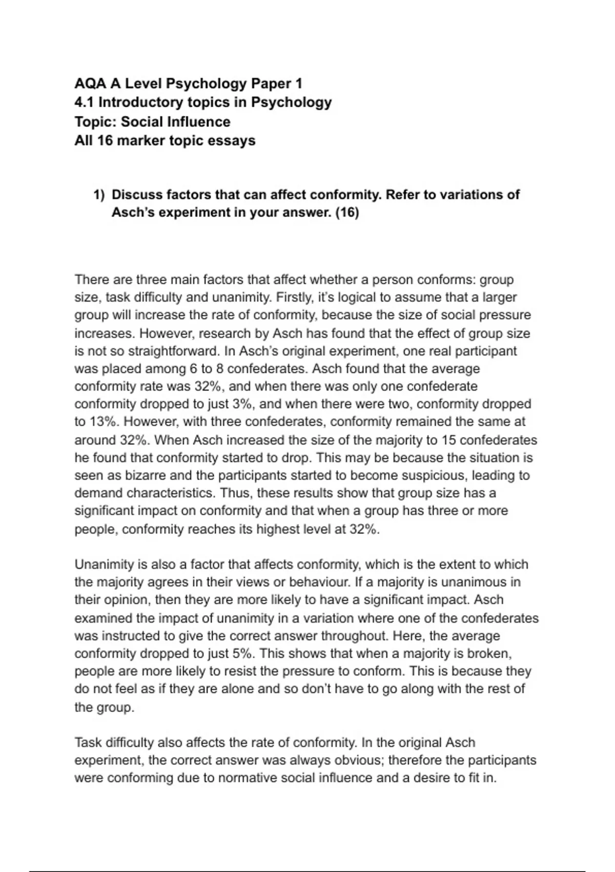 This document contains all the possible social influence 16 marker essays that could come up on your Psychology Paper 1 exam for the AQA examboard. It can also be used for shorter answers, or just some general revision for the topic. Great for AO3, as it also contains counter criticisms which helps boost your marks for AO3!