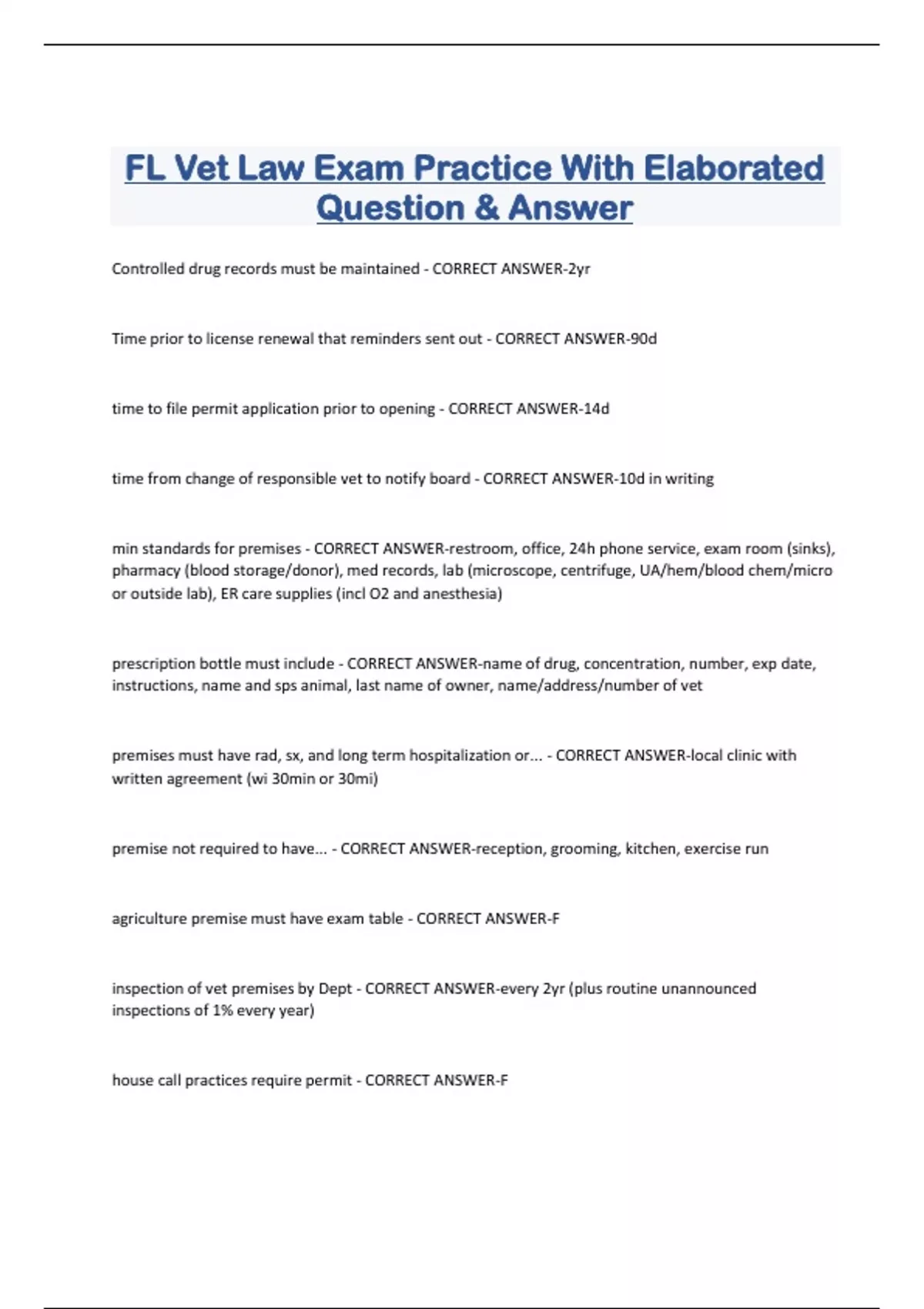 FL Vet Law Exam Practice With Elaborated Question & Answer Controlled drug records must be maintained - CORRECT ANSWER-2yr Time prior to license renewal that reminders sent out - CORRECT ANSWER-90d time to file permit application prior to opening - CORRECT ANSWER-14d time from change of responsible vet to notify board - CORRECT ANSWER-10d in writing