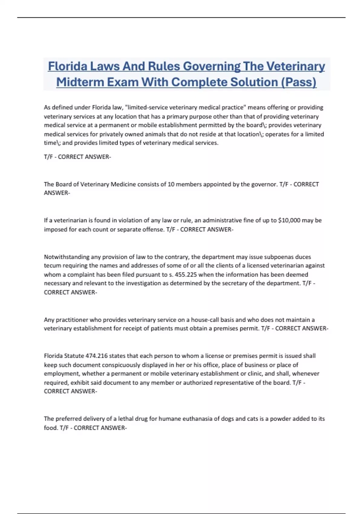 Florida Laws And Rules Governing The Veterinary Midterm Exam With Complete Solution (Pass) As defined under Florida law, "limited-service veterinary medical practice" means offering or providing veterinary services at any location that has a primary purpose other than that of providing veterinary medical service at a permanent or mobile establishment permitted by the board; provides veterinary medical services for privately owned animals that do not reside at that location; operates for a limited time; and provides limited types of veterinary medical services. T/F - CORRECT ANSWERThe Board of Veterinary Medicine consists of 10 members appointed by the governor. T/F - CORRECT ANSWERIf a veterinarian is found in violation of any law or rule, an administrative fine of up to $10,000 may be imposed for each count or separate offense. T/F - CORRECT ANSWER
