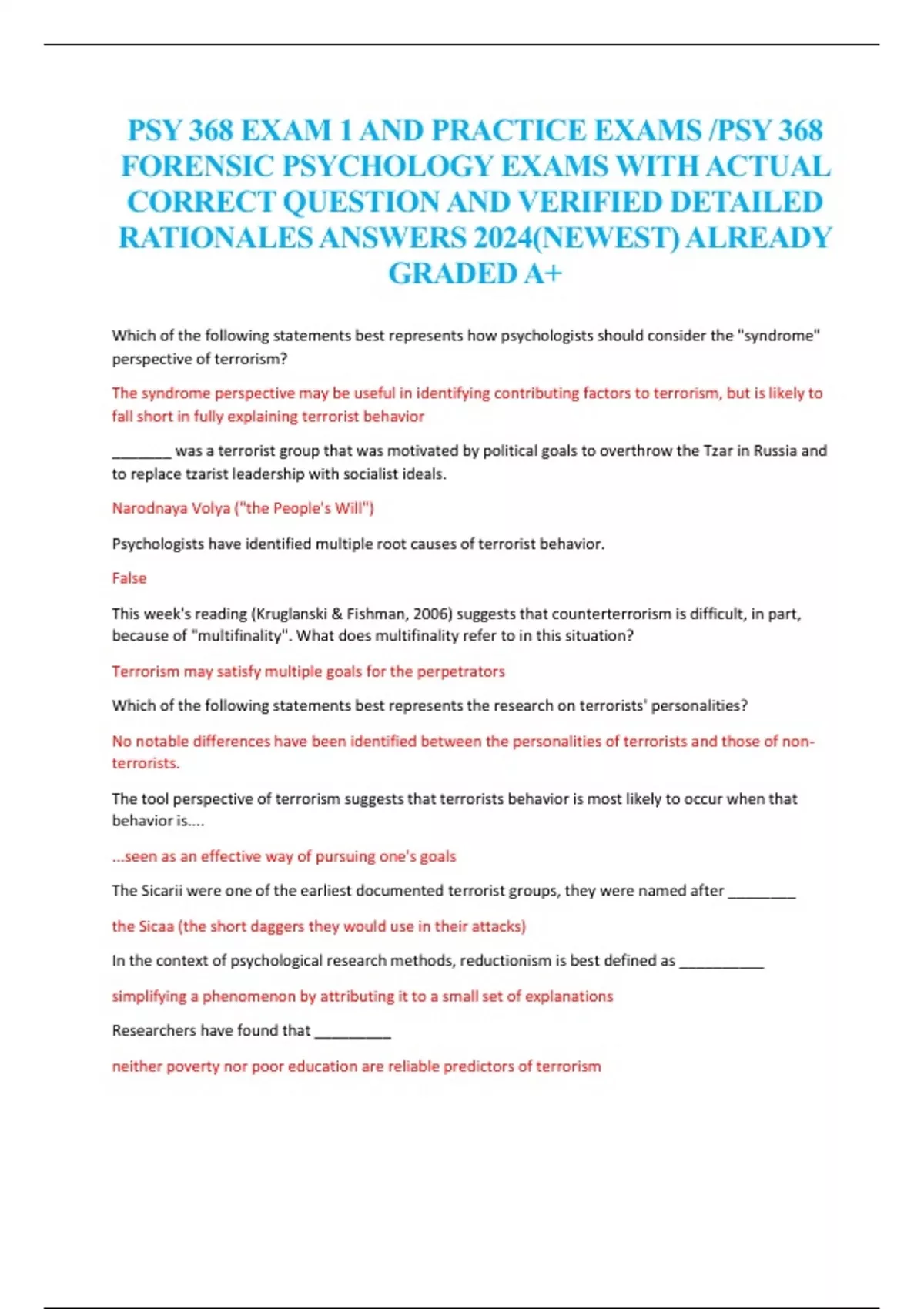 PSY 368 EXAM 1AND PRACTICE EXAMS /PSY 368 FORENSIC PSYCHOLOGY EXAMS WITH ACTUAL CORRECT QUESTION AND VERIFIED DETAILED RATIONALES ANSWERS 2024(NEWEST) ALREADY GRADED A+