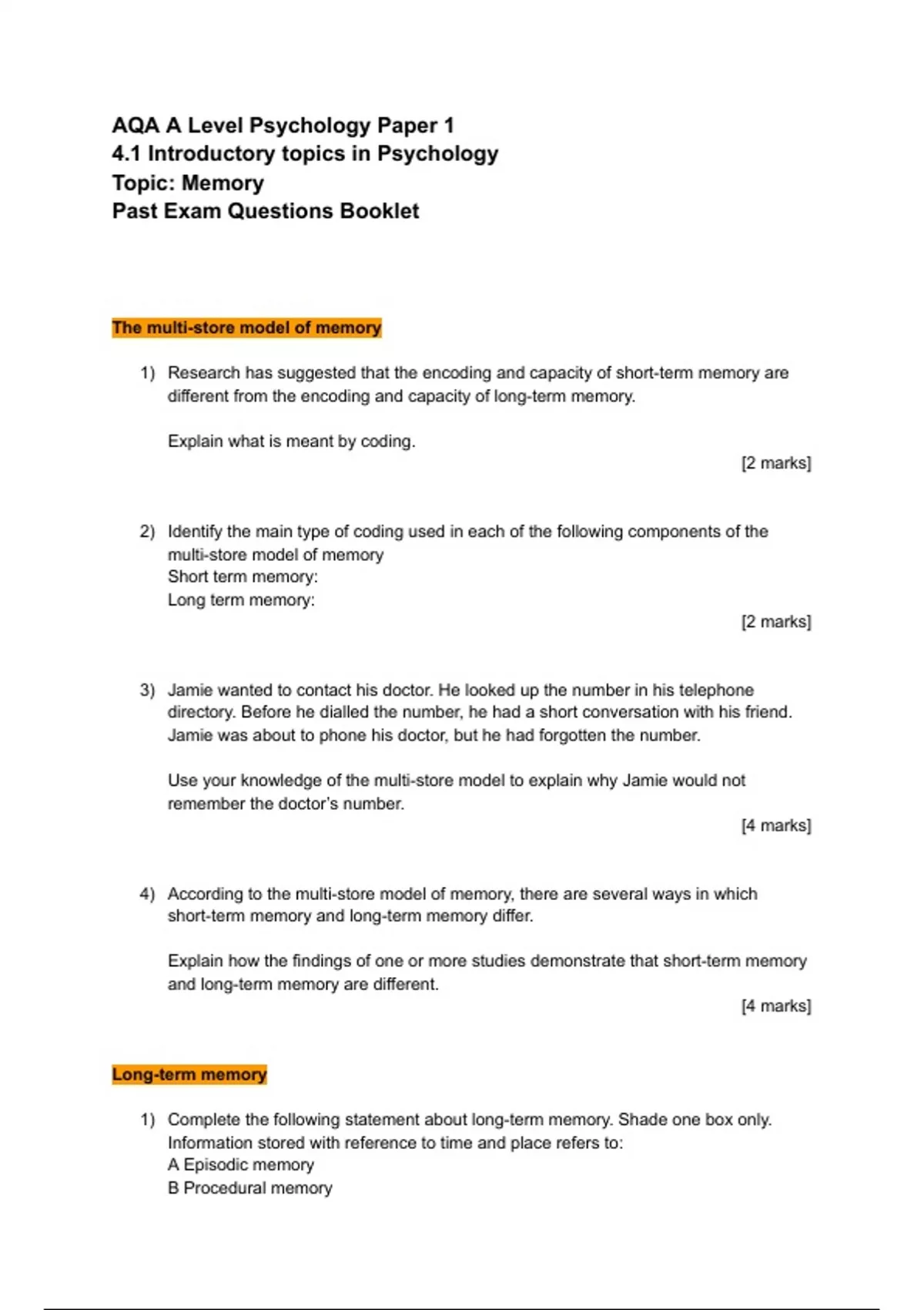 This document contains some past exam questions from the Memory section from Paper 1 Psychology; these questions could come up on your Psychology Paper 1 exam for the AQA examboard. It can also be used for shorter answers, or just some general revision for the topic.