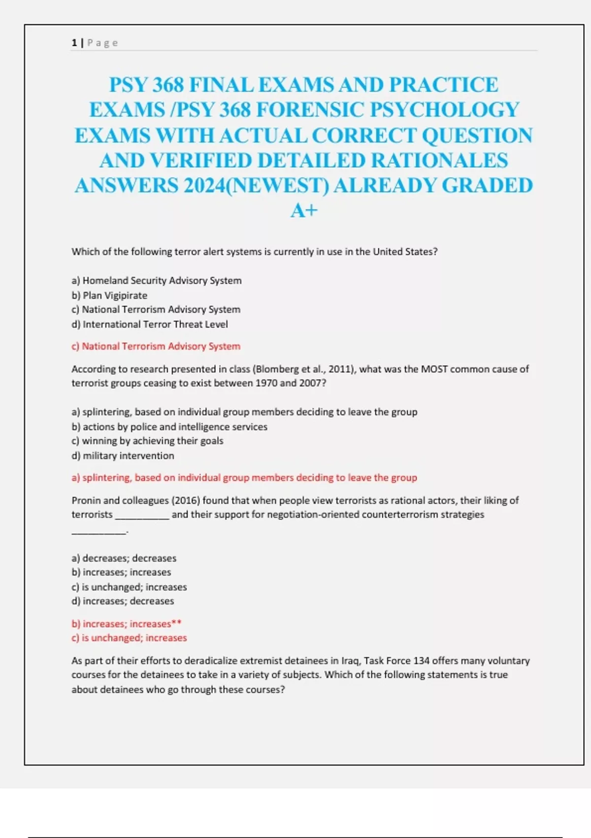 PSY 368 FINAL EXAMS AND PRACTICE EXAMS /PSY 368 FORENSIC PSYCHOLOGY EXAMS WITH ACTUAL CORRECT QUESTION AND VERIFIED DETAILED RATIONALES ANSWERS 2024(NEWEST) ALREADY GRADED A+