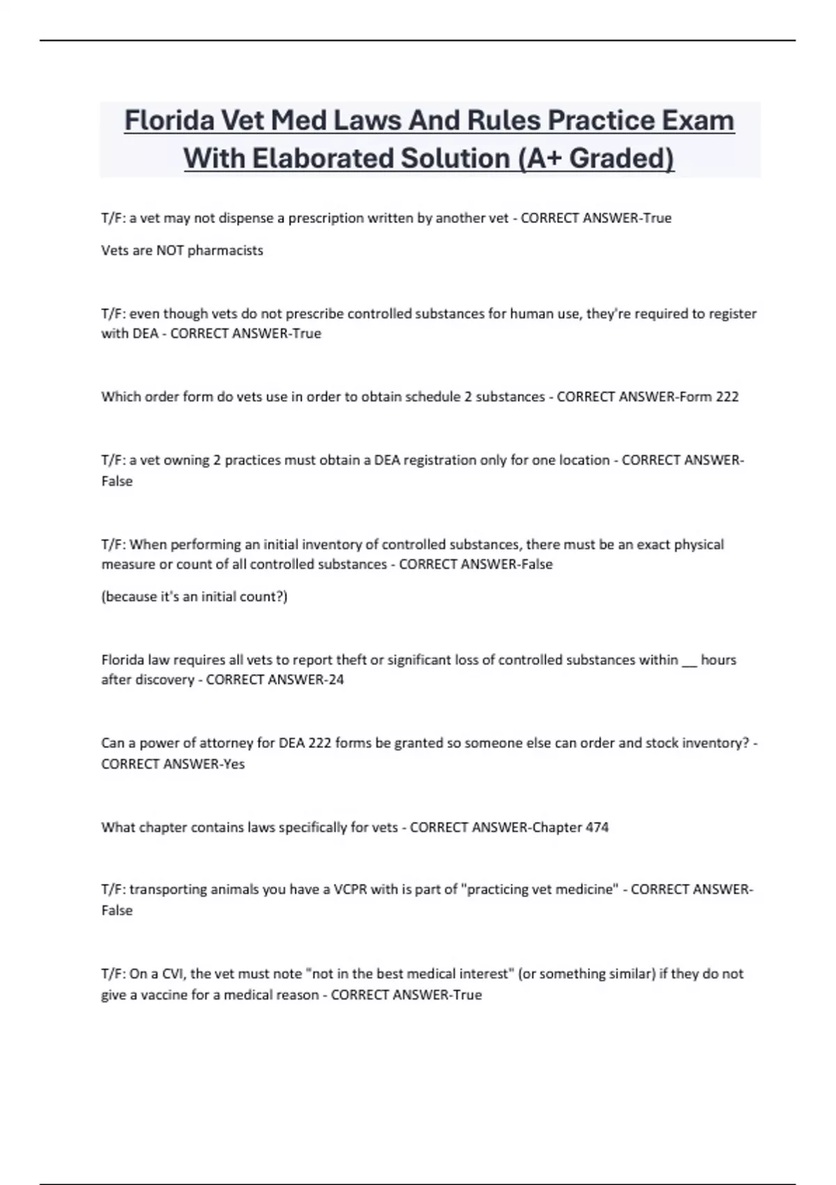 Florida Vet Med Laws And Rules Practice Exam With Elaborated Solution (A+ Graded) T/F: a vet may not dispense a prescription written by another vet - CORRECT ANSWER-True Vets are NOT pharmacists T/F: even though vets do not prescribe controlled substances for human use, they're required to register with DEA - CORRECT ANSWER-True Which order form do vets use in order to obtain schedule 2 substances - CORRECT ANSWER-Form 222 T/F: a vet owning 2 practices must obtain a DEA registration only for one location - CORRECT ANSWERFalse