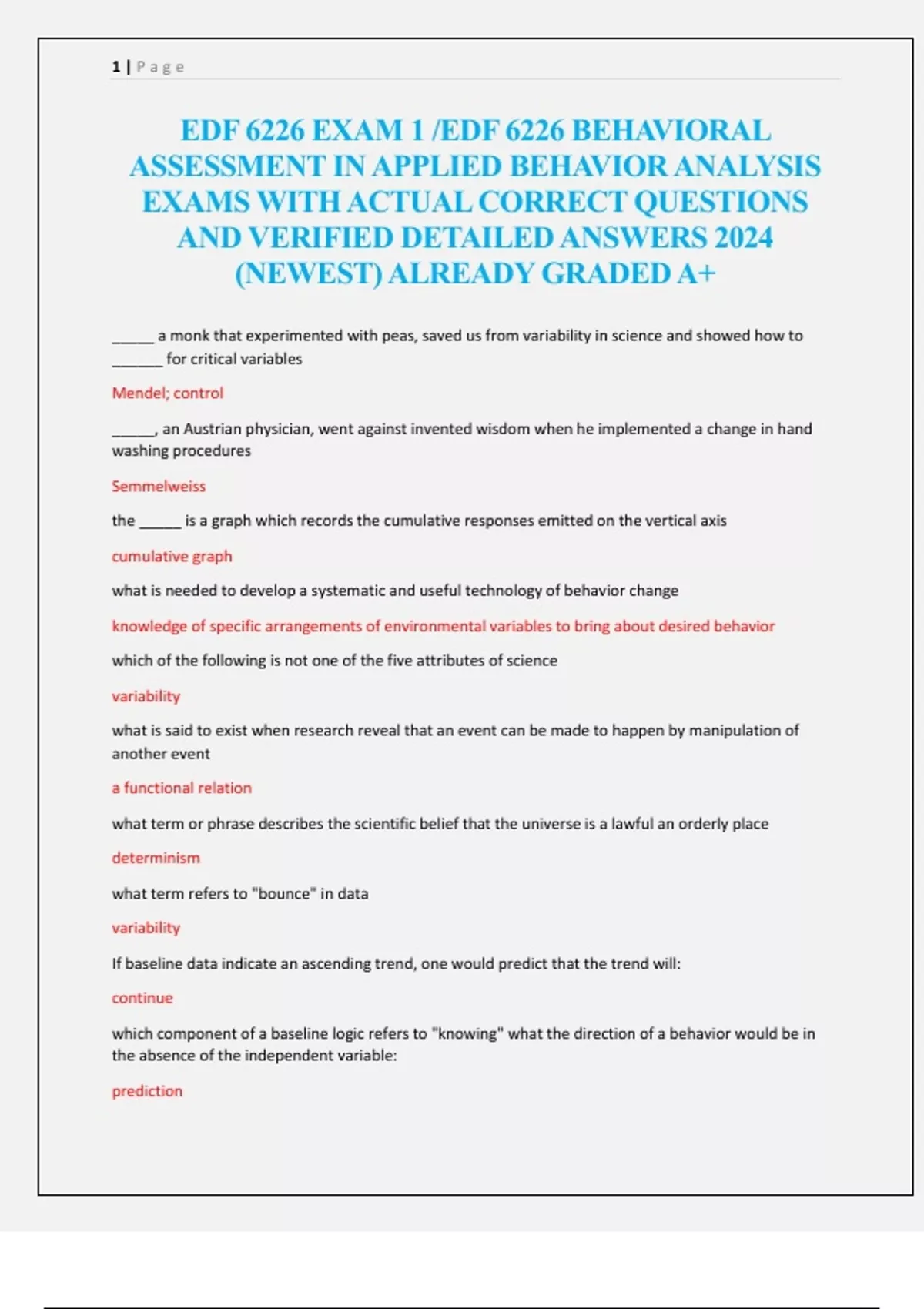 EDF 6226 EXAM 1 /EDF 6226 BEHAVIORAL ASSESSMENT IN APPLIED BEHAVIOR ANALYSIS EXAMS WITH ACTUAL CORRECT QUESTIONS AND VERIFIED DETAILED ANSWERS 2024 (NEWEST) ALREADY GRADED A+