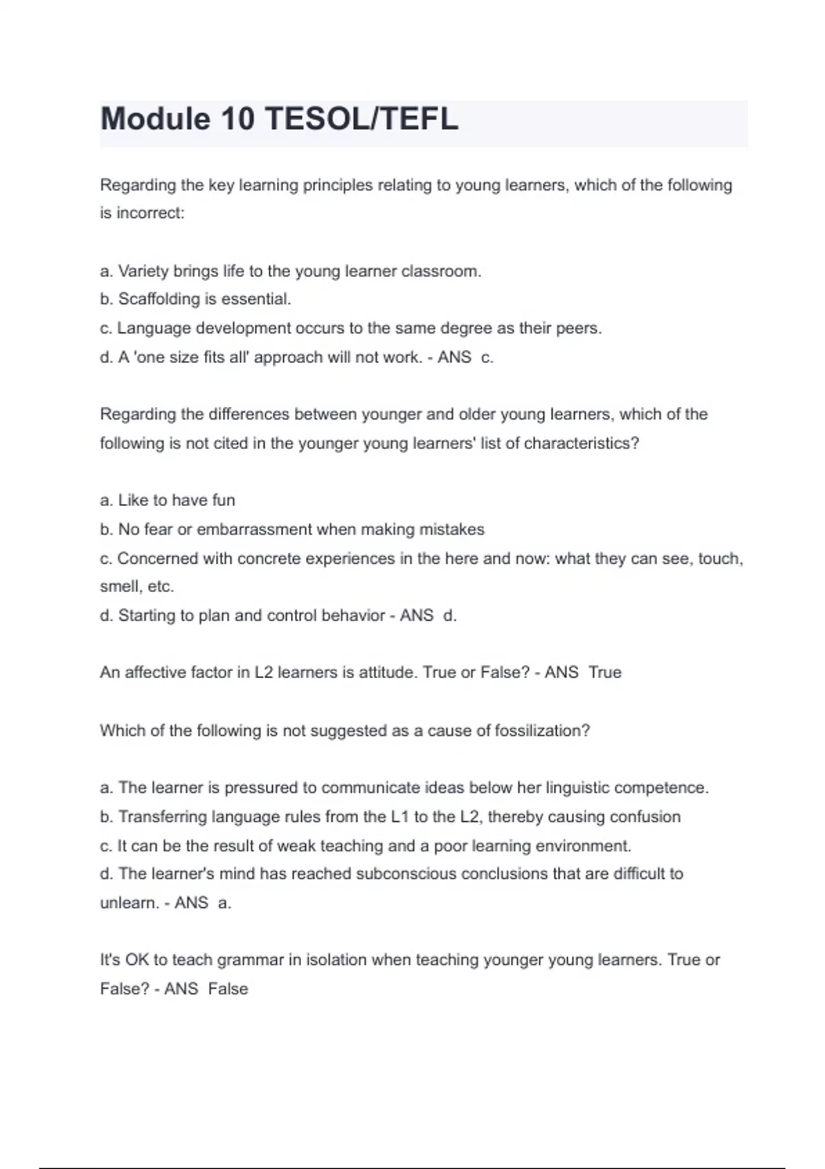 Module 10 TESOL/TEFL EXAM QUESTIONS AND ANSWERS Regarding the key learning principles relating to young learners, which of the following is incorrect: a. Variety brings life to the young learner classroom. b. Scaffolding is essential. c. Language development occurs to the same degree as their peers. d. A 'one size fits all' approach will not work. - ANS c. Regarding the differences between younger and older young learners, which of the following is not cited in the younger young learners' list of characteristics? a. Like to have fun b. No fear or embarrassment when making mistakes c. Concerned with concrete experiences in the here and now: what they can see, touch, smell, etc. d. Starting to plan and control behavior - ANS d.
