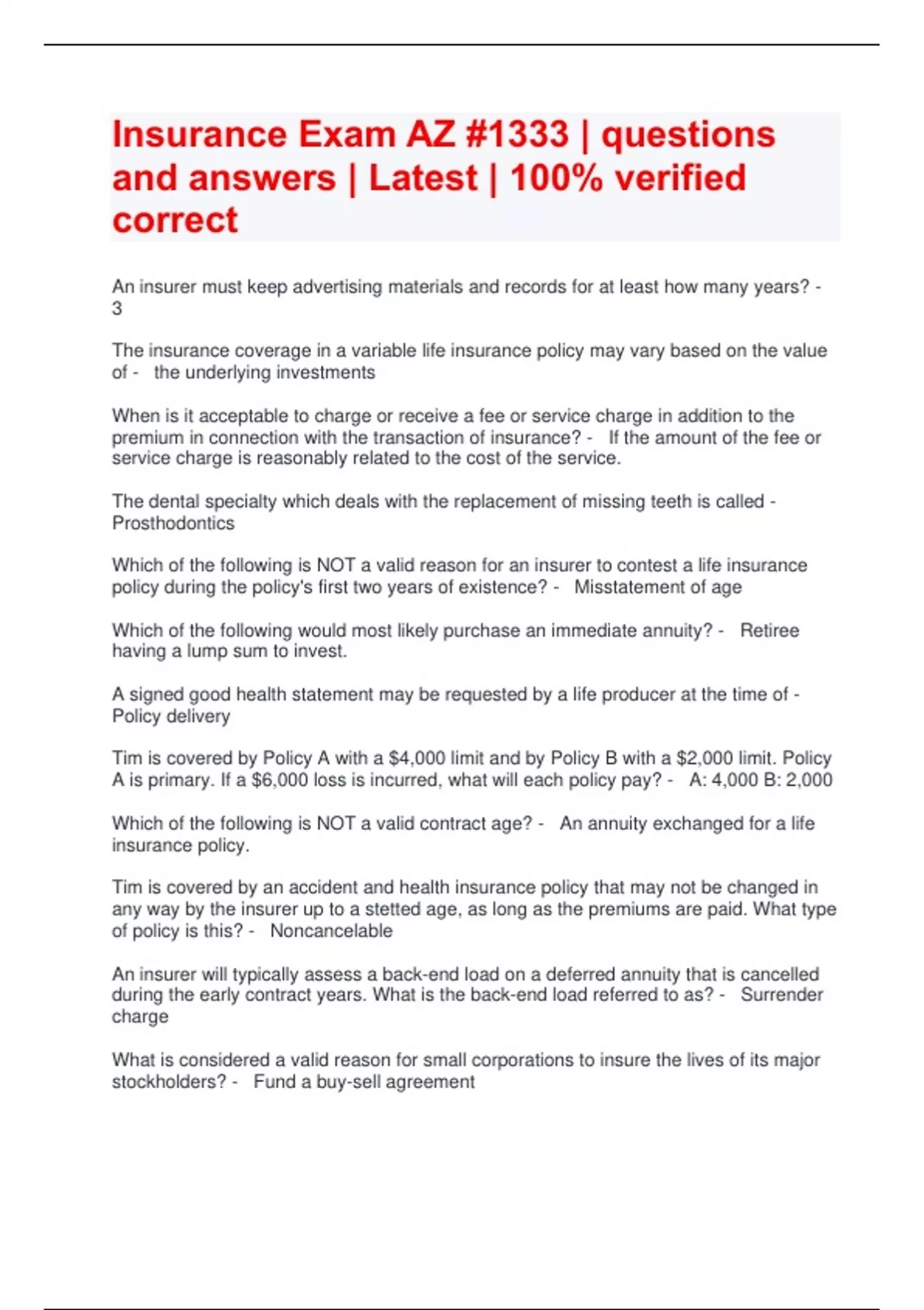 Insurance Exam AZ #1333 | questions and answers | Latest | 100% verified correct
