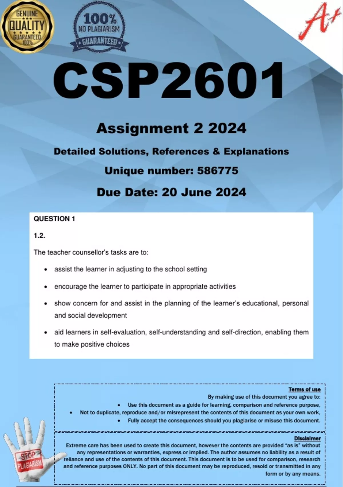 CSP2601 Assignment 2 (COMPLETE ANSWERS) 2024 (586775) - DUE 20 June 2024 ;100% TRUSTED workings, explanations and solutions. for assistance Whats-App.......0.6.7..1.7.1..1.7.3.9.......... QUESTION 1: [25 marks] 1.1 A meaningful life comprises of FIVE elements. Draw a mind map using these FIVE elements as central themes. Use the study guide content to summarise the main ideas linked to each element as major themes in the mind map. The content must be summarised within the mind map. (20) 1.2 What are the important tasks of a teacher counsellor? (5) QUESTION 2 [25 marks] 2.1 Read the brief case study below and answer the questions that follow. Mia is a happy and thriving 13-year-old girl navigating the complexities of adolescence while balancing familial responsibilities and learning challenges. She lives in a bustling urban setting with her single mother and two younger siblings. Despite her mother's difficulties, who works tirelessly in multiple jobs to provide for the family's needs, Mia is a dedicated and caring older sibling, nurturing her own aspirations while tending to the needs of her brother and sister. Mia attends a diverse urban middle school that is committed to inclusivity. The school prioritises student well-being, and resources for academic support are readily available. 6 Mia's teachers are attentive to the challenges she may face and actively engage in providing guidance and support for her academic and personal growth. Despite her busy schedule, Mia's mother has maintained an atmosphere of free communication in their household. Mia's support system is built on her mother-daughter connection, where she discusses not just her academic accomplishments but also the daily struggles of adolescence. Mia's younger siblings share in all the responsibilities. Mia, while pursuing her own academic ambitions, also acts as a guiding presence for her siblings, cultivating a healthy family environment of collaboration and mutual support that is critical to their shared path. Mia's school plays a crucial role in her journey. It's committed to inclusivity, valuing diversity, and providing academic support to each student. Teachers foster an environment where every student can thrive and go beyond traditional educational roles to support Mia through adolescence. Her story highlights resilience, support, and academic success. 2.1.1. Mia's mother actively participates in her education and provides emotional support. What support does she provide, and how does this support contribute to Mia's resilience and academic success? (8) 2.1.2 Identify specific resources offered by Mia's school to support her academic journey and overall well-being. (4) 2.1.3 What are Mia’s internal resources that act as protective factors for her and her family? List the resources and discuss how they serve as protective factors. (6) 2.1.4 Reflect on what factors may contribute to individual and family adversities in this case study. (7)