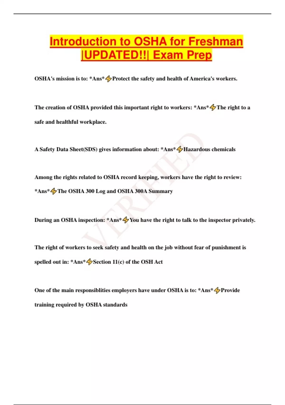 Introduction to OSHA for Freshman |UPDATED!!| Exam Prep OSHA's mission is to: *Ans* Protect the safety and health of America's workers. The creation of OSHA provided this important right to workers: *Ans* The right to a safe and healthful workplace. A Safety Data Sheet(SDS) gives information about: *Ans* Hazardous chemicals Among the rights related to OSHA record keeping, workers have the right to review: *Ans* The OSHA 300 Log and OSHA 300A Summary During an OSHA inspection: *Ans* You have the right to talk to the inspector privately. The right of workers to seek safety and health on the job without fear of punishment is spelled out in: *Ans* Section 11(c) of the OSH Act One of the main responsiblities employers have under OSHA is to: *Ans* Provide training required by OSHA standards
