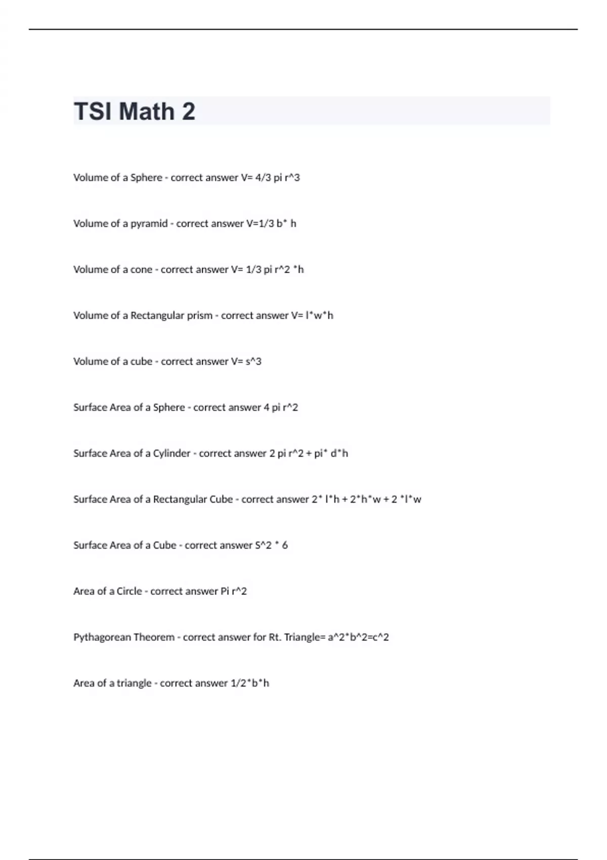 Volume of a Sphere - correct answer V= 4/3 pi r^3 Volume of a pyramid - correct answer V=1/3 b* h Volume of a cone - correct answer V= 1/3 pi r^2 *h Volume of a Rectangular prism - correct answer V= l*w*h Volume of a cube - correct answer V= s^3 Surface Area of a Sphere - correct answer 4 pi r^2 Surface Area of a Cylinder - correct answer 2 pi r^2 + pi* d*h Surface Area of a Rectangular Cube - correct answer 2* l*h + 2*h*w + 2 *l*w Surface Area of a Cube - correct answer S^2 * 6 Area of a Circle - correct answer Pi r^2 Pythagorean Theorem - correct answer for Rt. Triangle= a^2*b^2=c^2 Area of a triangle - correct answer 1/2*b*h