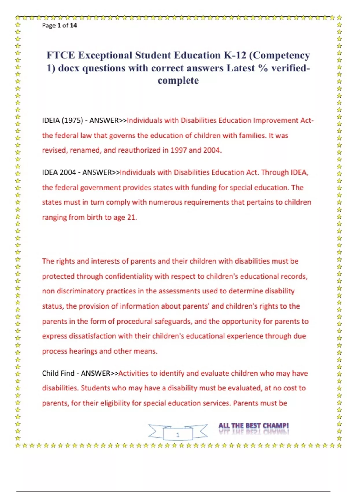 FTCE Exceptional Student Education K-12 (Competency 1) docx questions with correct answers Latest - verified-complete