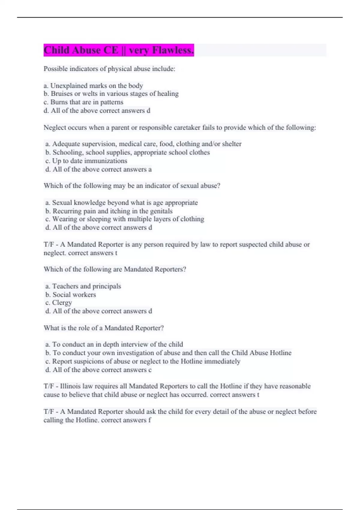 Possible indicators of physical abuse include: a. Unexplained marks on the body b. Bruises or welts in various stages of healing c. Burns that are in patterns d. All of the above correct answers d Neglect occurs when a parent or responsible caretaker fails to provide which of the following: a. Adequate supervision, medical care, food, clothing and/or shelter b. Schooling, school supplies, appropriate school clothes c. Up to date immunizations d. All of the above correct answers a Which of the following may be an indicator of sexual abuse? a. Sexual knowledge beyond what is age appropriate b. Recurring pain and itching in the genitals c. Wearing or sleeping with multiple layers of clothing d. All of the above correct answers d T/F - A Mandated Reporter is any person required by law to report suspected child abuse or neglect. correct answers t Which of the following are Mandated Reporters? a. Teachers and principals b. Social workers c. Clergy d. All of the above correct answers d What is the role of a Mandated Reporter? a. To conduct an in depth interview of the child b. To conduct your own investigation of abuse and then call the Child Abuse Hotline c. Report suspicions of abuse or neglect to the Hotline immediately d. All of the above correct answers c T/F - Illinois law requires all Mandated Reporters to call the Hotline if they have reasonable cause to believe that child abuse or neglect has occurred. correct answers t T/F - A Mandated Reporter should ask the child for every detail of the abuse or neglect before calling the Hotline. correct answers f
