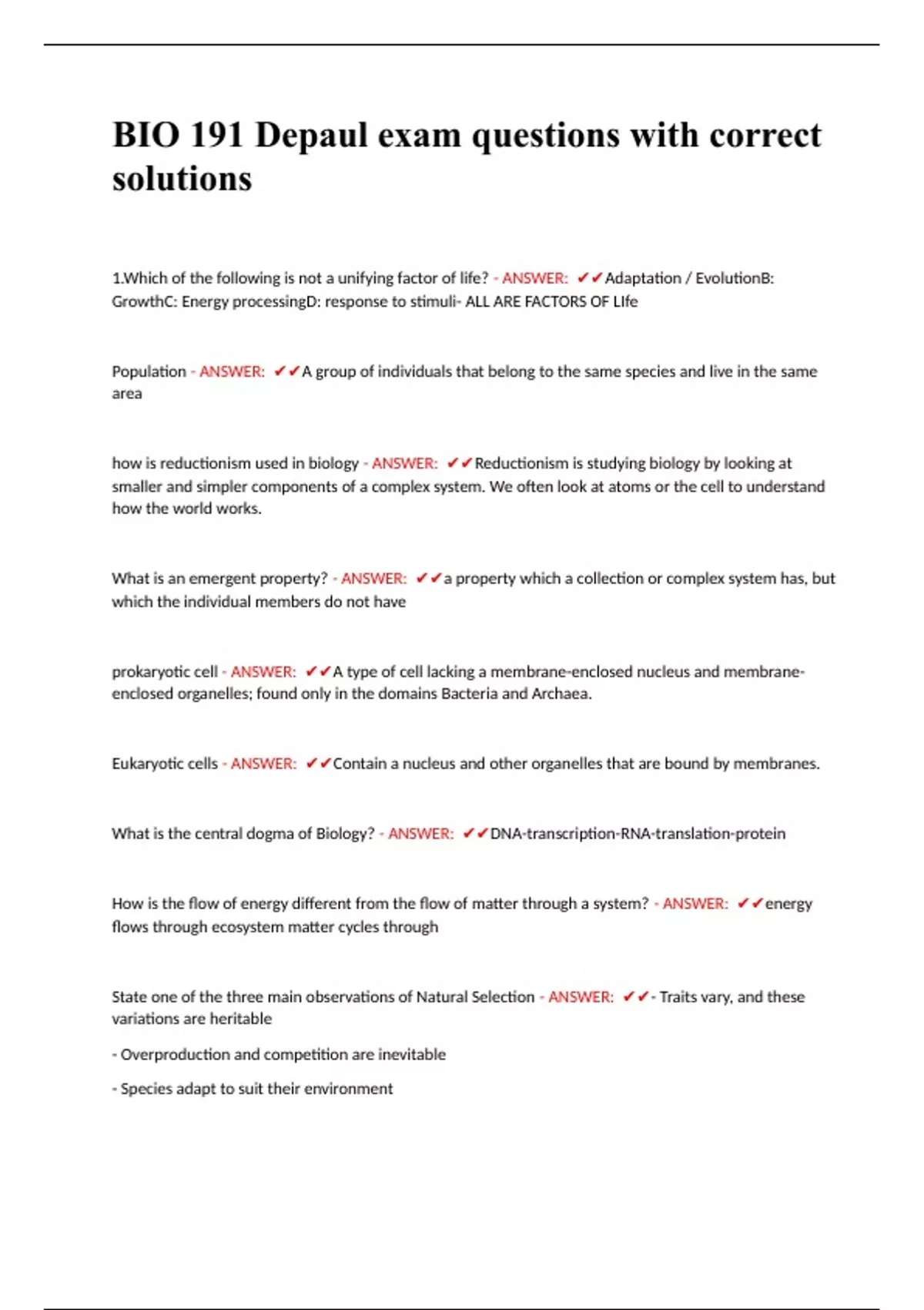 bio 191 depaul exam questions with correct solutio