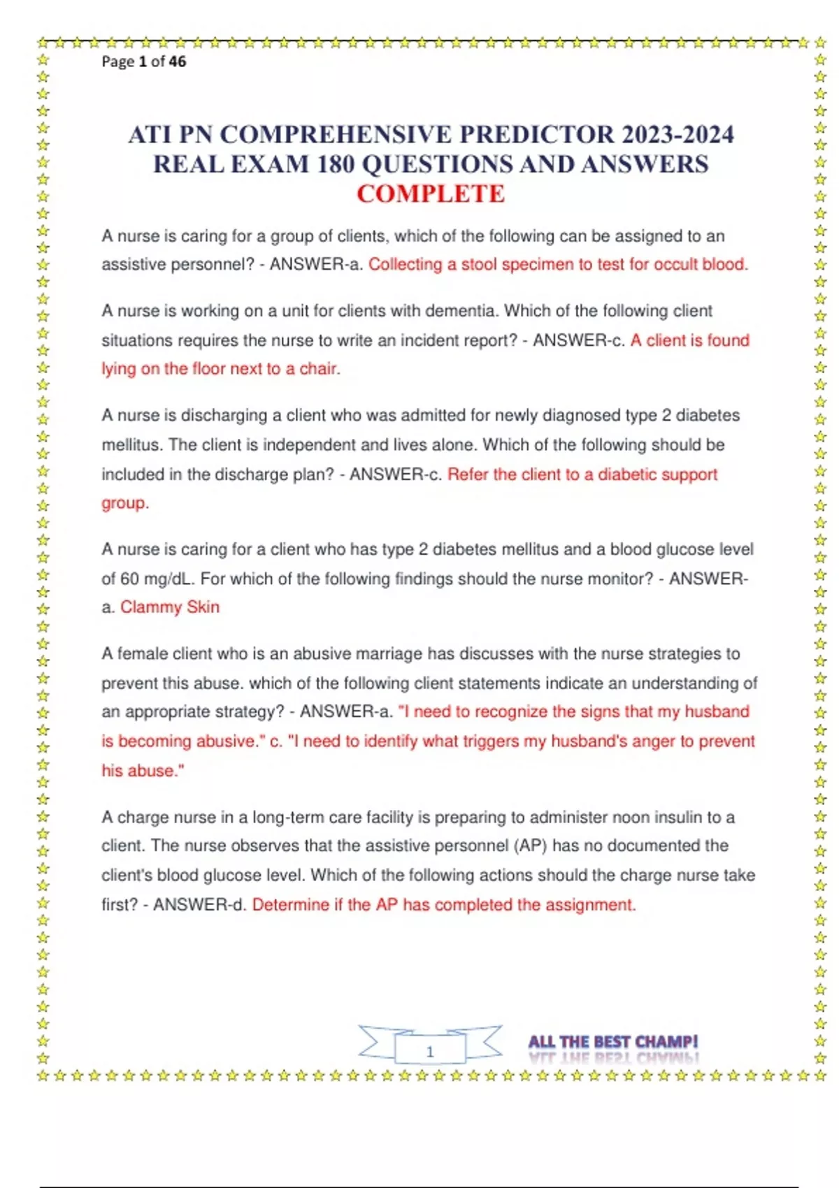 ATI PN COMPREHENSIVE PREDICTOR REAL EXAM 180 QUESTIONS AND ANSWERS COMPLETE.