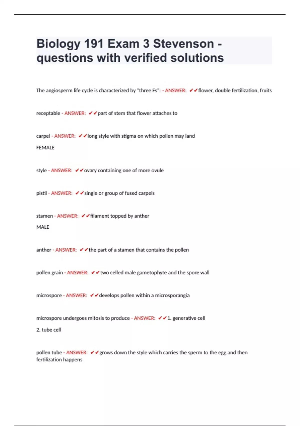 Biology 191 Exam 3 Stevenson -questions with verified solutions.