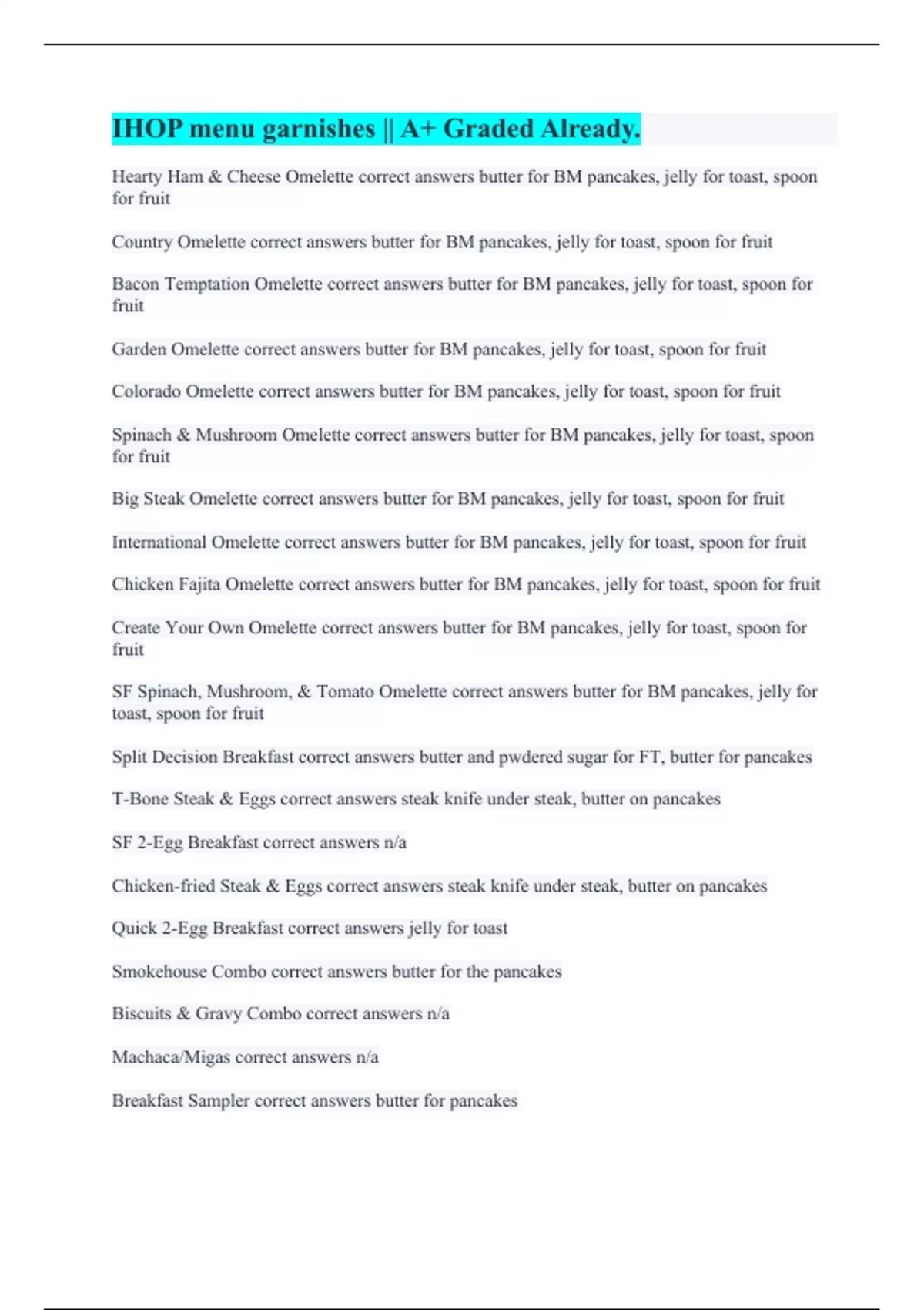 Hearty Ham & Cheese Omelette correct answers butter for BM pancakes, jelly for toast, spoon for fruit Country Omelette correct answers butter for BM pancakes, jelly for toast, spoon for fruit Bacon Temptation Omelette correct answers butter for BM pancakes, jelly for toast, spoon for fruit Garden Omelette correct answers butter for BM pancakes, jelly for toast, spoon for fruit Colorado Omelette correct answers butter for BM pancakes, jelly for toast, spoon for fruit Spinach & Mushroom Omelette correct answers butter for BM pancakes, jelly for toast, spoon for fruit Big Steak Omelette correct answers butter for BM pancakes, jelly for toast, spoon for fruit International Omelette correct answers butter for BM pancakes, jelly for toast, spoon for fruit Chicken Fajita Omelette correct answers butter for BM pancakes, jelly for toast, spoon for fruit Create Your Own Omelette correct answers butter for BM pancakes, jelly for toast, spoon for fruit SF Spinach, Mushroom, & Tomato Omelette correct answers butter for BM pancakes, jelly for toast, spoon for fruit Split Decision Breakfast correct answers butter and pwdered sugar for FT, butter for pancakes T-Bone Steak & Eggs correct answers steak knife under steak, butter on pancakes SF 2-Egg Breakfast correct answers n/a Chicken-fried Steak & Eggs correct answers steak knife under steak, butter on pancakes Quick 2-Egg Breakfast correct answers jelly for toast Smokehouse Combo correct answers butter for the pancakes Biscuits & Gravy Combo correct answers n/a Machaca/Migas correct answers n/a Breakfast Sampler correct answers butter for pancakes