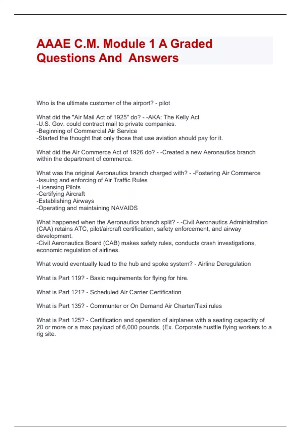 Who is the ultimate customer of the airport? - pilot What did the "Air Mail Act of 1925" do? - -AKA: The Kelly Act -U.S. Gov. could contract mail to private companies. -Beginning of Commercial Air Service -Started the thought that only those that use aviation should pay for it. What did the Air Commerce Act of 1926 do? - -Created a new Aeronautics branch within the department of commerce. What was the original Aeronautics branch charged with? - -Fostering Air Commerce -Issuing and enforcing of Air Traffic Rules -Licensing Pilots -Certifying Aircraft -Establishing Airways -Operating and maintaining NAVAIDS What happened when the Aeronautics branch split? - -Civil Aeronautics Administration (CAA) retains ATC, pilot/aircraft certification, safety enforcement, and airway development. -Civil Aeronautics Board (CAB) makes safety rules, conducts crash investigations, economic regulation of airlines. What would eventually lead to the hub and spoke system? - Airline Deregulation What is Part 119? - Basic requirements for flying for hire. What is Part 121? - Scheduled Air Carrier Certification What is Part 135? - Communter or On Demand Air Charter/Taxi rules What is Part 125? - Certification and operation of airplanes with a seating capactity of 20 or more or a max payload of 6,000 pounds. (Ex. Corporate husttle flying workers to a rig site.