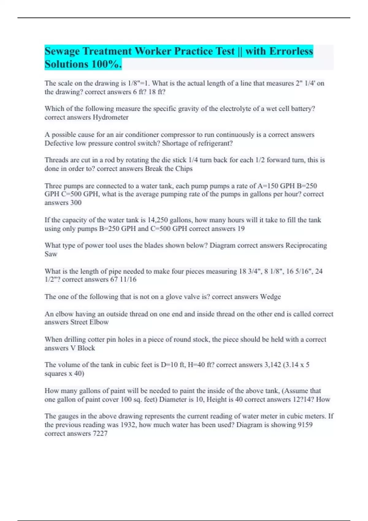 Sewage Treatment Worker Practice Test || with Errorless Solutions 100%.