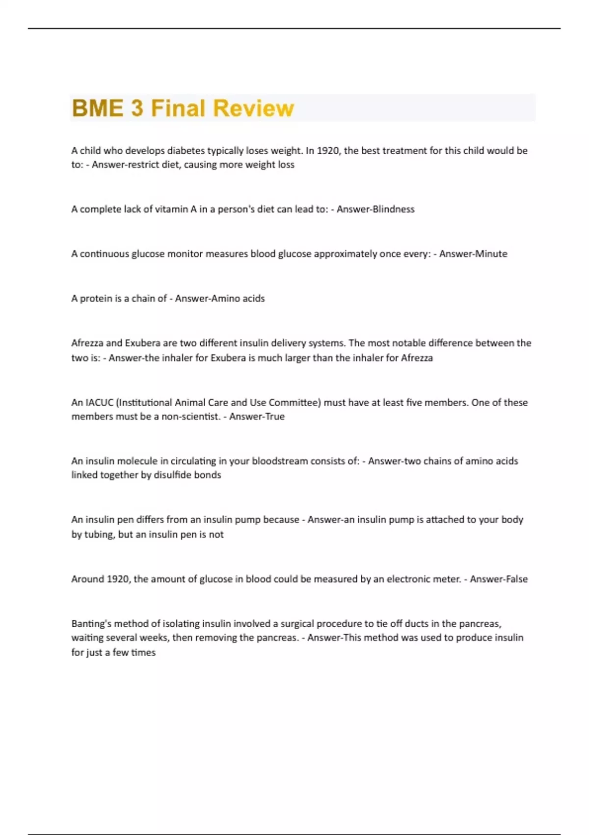 BME 3 Final Review Questions And Answers With Verified Study Solutions