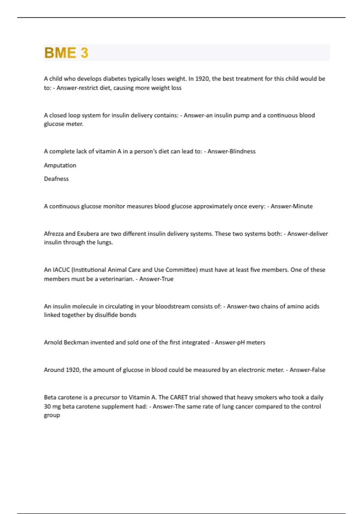 A child who develops diabetes typically loses weight. In 1920, the best treatment for this child would be to: - Answer-restrict diet, causing more weight loss A closed loop system for insulin delivery contains: - Answer-an insulin pump and a continuous blood glucose meter. A complete lack of vitamin A in a person's diet can lead to: - Answer-Blindness Amputation Deafness A continuous glucose monitor measures blood glucose approximately once every: - Answer-Minute Afrezza and Exubera are two different insulin delivery systems. These two systems both: - Answer-deliver insulin through the lungs. An IACUC (Institutional Animal Care and Use Committee) must have at least five members. One of these members must be a veterinarian. - Answer-True An insulin molecule in circulating in your bloodstream consists of: - Answer-two chains of amino acids linked together by disulfide bonds Arnold Beckman invented and sold one of the first integrated - Answer-pH meters Around 1920, the amount of glucose in blood could be measured by an electronic meter. - Answer-False Beta carotene is a precursor to Vitamin A. The CARET trial showed that heavy smokers who took a daily 30 mg beta carotene supplement had: - Answer-The same rate of lung cancer compared to the control groupCharles Evan Hughes, the US Secretary of State in 1920, was diagnosed with diabetes in 1920. - AnswerFalse Diabetes was first described - Answer-Independently by many different cultures During the summer of 1921, Fred Banting performed experiments on dogs. In one group of dogs, he tried to cause the dogs to develop diabetes by removing an organ. Which organ did he remove: - Answer-Pancreas Fred Banting died in 1941 from: - Answer-A plane crash From the 1920s through the 1960s, insulin used by patients with diabetes came from which sources: - Answer-pigs and cows. George Walden was the engineer at the Eli Lilly in charge of insulin production and purification. George Walden's major contribution was that: - Answer-He invented isoelectric precipitation. Glucose Oxidase was isolated from: - Answer-A fungus How many quizzes are there during the entire course? - Answer-10 Hypoglycemia can be alleviated by injecting insulin. - Answer-Fal