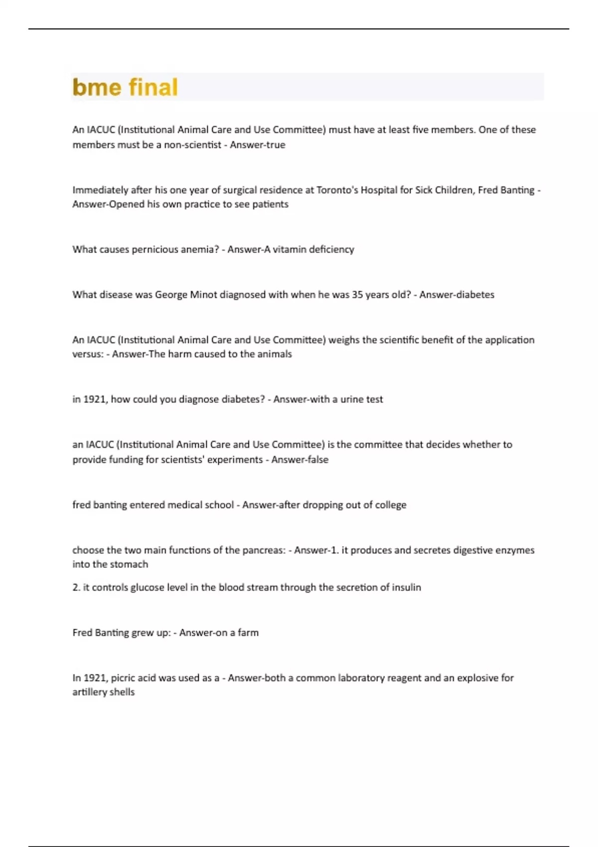An IACUC (Institutional Animal Care and Use Committee) must have at least five members. One of these members must be a non-scientist - Answer-true Immediately after his one year of surgical residence at Toronto's Hospital for Sick Children, Fred Banting - Answer-Opened his own practice to see patients What causes pernicious anemia? - Answer-A vitamin deficiency What disease was George Minot diagnosed with when he was 35 years old? - Answer-diabetes An IACUC (Institutional Animal Care and Use Committee) weighs the scientific benefit of the application versus: - Answer-The harm caused to the animals in 1921, how could you diagnose diabetes? - Answer-with a urine test an IACUC (Institutional Animal Care and Use Committee) is the committee that decides whether to provide funding for scientists' experiments - Answer-false fred banting entered medical school - Answer-after dropping out of college choose the two main functions of the pancreas: - Answer-1. it produces and secretes digestive enzymes into the stomach 2. it controls glucose level in the blood stream through the secretion of insulin Fred Banting grew up: - Answer-on a farm In 1921, picric acid was used as a - Answer-both a common laboratory reagent and an explosive for artillery shellsFred Banting performed his experiments on dogs at - Answer-University of Toronto In 1921, the best way to measure glucose in blood was based on: - Answer-the final color of a mixture of blood and some reagents During the summer of 1921, Fred Banting performed experiments on dogs. In one group of dogs, he tried to cause the dogs to develop diabetes by removing an organ. Which organ did he remove: - Answer-Pancreas The best treatment for diabetes about 1915 was known as: - Answer-The starvation diet Charles Evan Hughes, the US Secretary of State in 1920, was diagnosed with diabetes in 1920. - Answerfalse Around 1920, the amount of glucose in blood could be measured by an electronic meter. - Answer-false Fred Banting developed his idea on how to treat diabetes while he was: - Answer-preparing a lecture for medical students blood test are only for measuring the number of red blood cells a person has - Answer-false a child who develops diabetes typically loses weight. in 1920, the best treatment for this child would be to: - Answer-restrict diet, causing more weight loss in 1921, the best way to measure glucose in the blood was based on: - Answer-the final color of a mixture of blood and some reagents James Collip, at the University of Toronto, developed a method to isolate insulin based upon - AnswerThe solubility of insulin in alcohol/water mixtures Arnold Beckman invented and sold one of the first integrated - Answer-pH meters