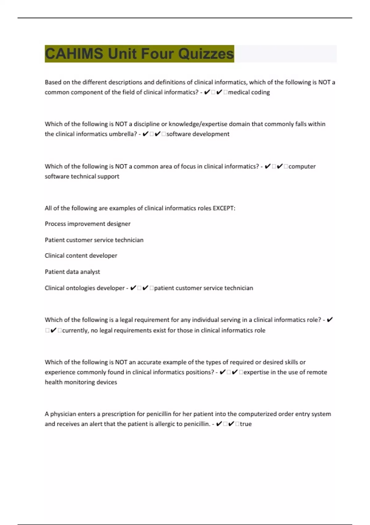 Based on the different descriptions and definitions of clinical informatics, which of the following is NOT a common component of the field of clinical informatics? - ️️medical coding Which of the following is NOT a discipline or knowledge/expertise domain that commonly falls within the clinical informatics umbrella? - ️️software development Which of the following is NOT a common area of focus in clinical informatics? - ️️computer software technical support All of the following are examples of clinical informatics roles EXCEPT: Process improvement designer Patient customer service technician Clinical content developer Patient data analyst Clinical ontologies developer - ️️patient customer service technician Which of the following is a legal requirement for any individual serving in a clinical informatics role? - ️️currently, no legal requirements exist for those in clinical informatics role Which of the following is NOT an accurate example of the types of required or desired skills or experience commonly found in clinical informatics positions? - ️️expertise in the use of remote health monitoring devices A physician enters a prescription for penicillin for her patient into the computerized order entry system and receives an alert that the patient is allergic to penicillin. - ️️true