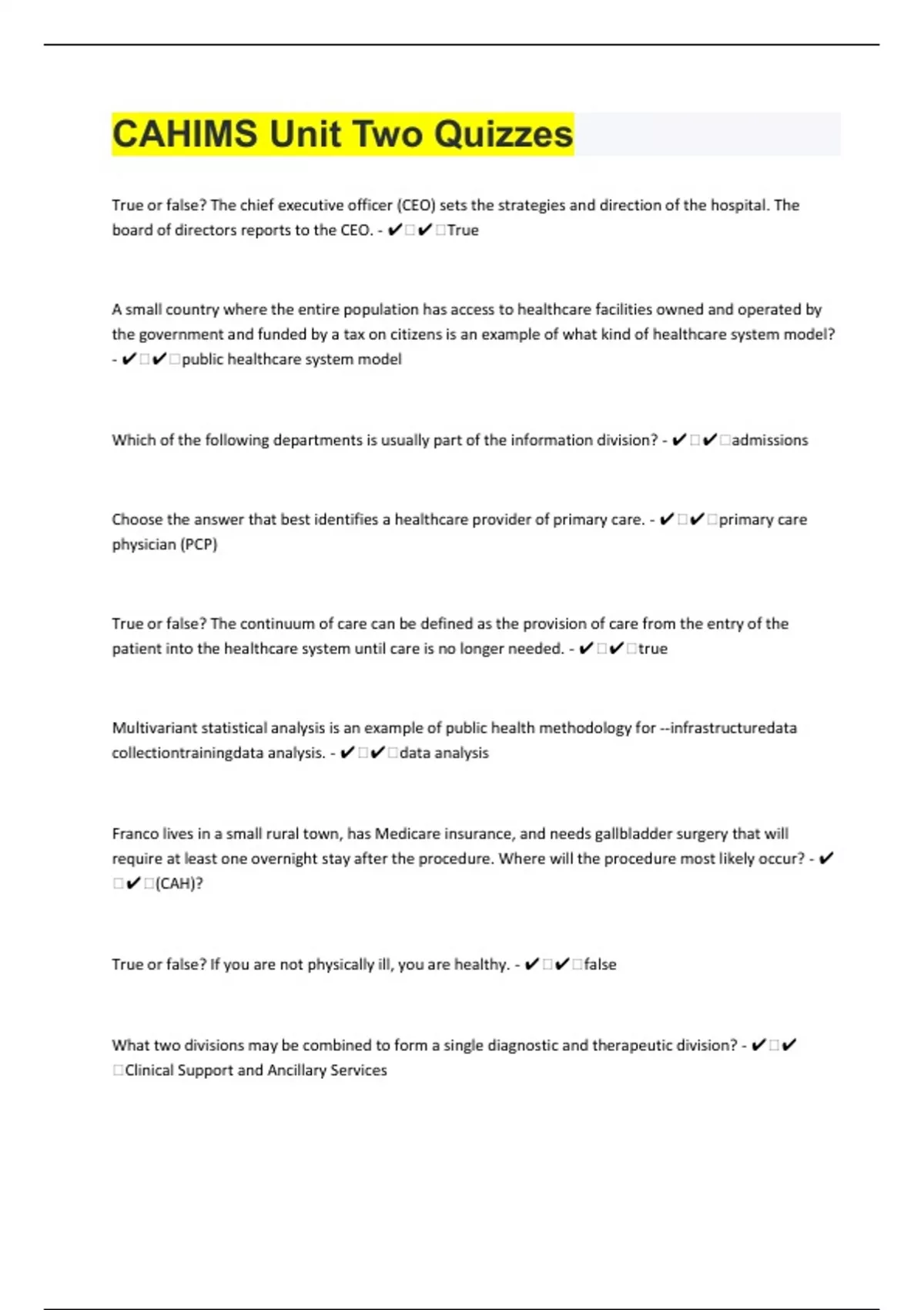 True or false? The chief executive officer (CEO) sets the strategies and direction of the hospital. The board of directors reports to the CEO. - ️️True A small country where the entire population has access to healthcare facilities owned and operated by the government and funded by a tax on citizens is an example of what kind of healthcare system model? - ️️public healthcare system model Which of the following departments is usually part of the information division? - ️️admissions Choose the answer that best identifies a healthcare provider of primary care. - ️️primary care physician (PCP) True or false? The continuum of care can be defined as the provision of care from the entry of the patient into the healthcare system until care is no longer needed. - ️️true Multivariant statistical analysis is an example of public health methodology for --infrastructuredata collectiontrainingdata analysis. - ️️data analysis Franco lives in a small rural town, has Medicare insurance, and needs gallbladder surgery that will require at least one overnight stay after the procedure. Where will the procedure most likely occur? - ️️(CAH)? True or false? If you are not physically ill, you are healthy. - ️️false What two divisions may be combined to form a single diagnostic and therapeutic division? - ️️Clinical Support and Ancillary Services