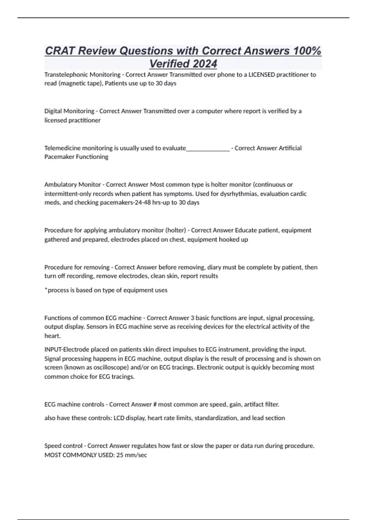CRAT Review Questions with Correct Answers 100% Verified 2024 Transtelephonic Monitoring - Correct Answer Transmitted over phone to a LICENSED practitioner to read (magnetic tape), Patients use up to 30 days Digital Monitoring - Correct Answer Transmitted over a computer where report is verified by a licensed practitioner Telemedicine monitoring is usually used to evaluate_____________ - Correct Answer Artificial Pacemaker Functioning Ambulatory Monitor - Correct Answer Most common type is holter monitor (continuous or intermittent-only records when patient has symptoms. Used for dysrhythmias, evaluation cardic meds, and checking pacemakers-24-48 hrs-up to 30 days Procedure for applying ambulatory monitor (holter) - Correct Answer Educate patient, equipment gathered and prepared, electrodes placed on chest, equipment hooked up Procedure for removing - Correct Answer before removing, diary must be complete by patient, then turn off recording, remove electrodes, clean skin, report results *process is based on type of equipment uses Functions of common ECG machine - Correct Answer 3 basic functions are input, signal processing, output display. Sensors in ECG machine serve as receiving devices for the electrical activity of the heart. INPUT-Electrode placed on patients skin direct impulses to ECG instrument, providing the input. Signal processing happens in ECG machine, output display is the result of processing and is shown on screen (known as oscilloscope) and/or on ECG tracings. Electronic output is quickly becoming most common choice for ECG tracings. ECG machine controls - Correct Answer # most common are speed, gain, artifact filter. also have these controls: LCD display, heart rate limits, standardization, and lead section Speed control - Correct Answer regulates how fast or slow the paper or data run during procedure. MOST