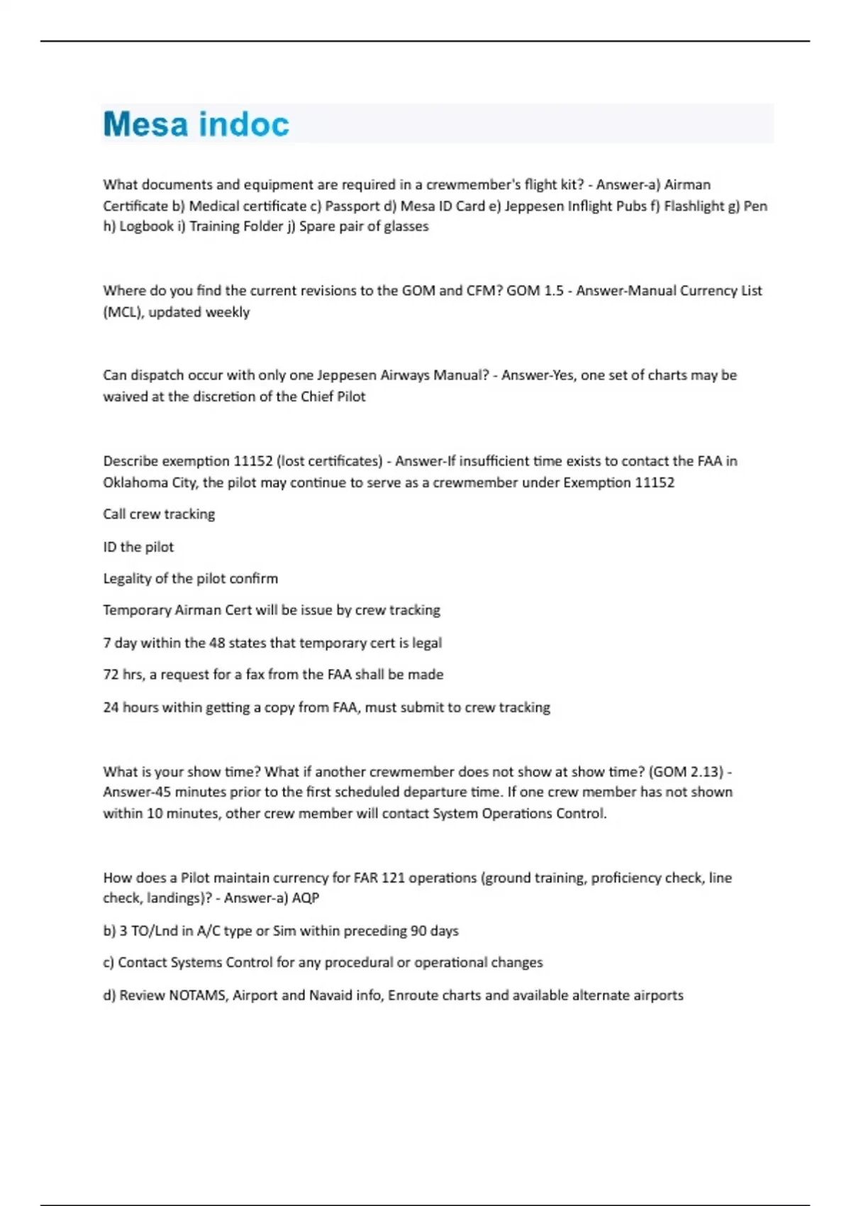 What documents and equipment are required in a crewmember's flight kit? - Answer-a) Airman Certificate b) Medical certificate c) Passport d) Mesa ID Card e) Jeppesen Inflight Pubs f) Flashlight g) Pen h) Logbook i) Training Folder j) Spare pair of glasses Where do you find the current revisions to the GOM and CFM? GOM 1.5 - Answer-Manual Currency List (MCL), updated weekly Can dispatch occur with only one Jeppesen Airways Manual? - Answer-Yes, one set of charts may be waived at the discretion of the Chief Pilot Describe exemption 11152 (lost certificates) - Answer-If insufficient time exists to contact the FAA in Oklahoma City, the pilot may continue to serve as a crewmember under Exemption 11152 Call crew tracking ID the pilot Legality of the pilot confirm Temporary Airman Cert will be issue by crew tracking 7 day within the 48 states that temporary cert is legal 72 hrs, a request for a fax from the FAA shall be made 24 hours within getting a copy from FAA, must submit to crew tracking What is your show time? What if another crewmember does not show at show time? (GOM 2.13) - Answer-45 minutes prior to the first scheduled departure time. If one crew member has not shown within 10 minutes, other crew member will contact System Operations Control. How does a Pilot maintain currency for FAR 121 operations (ground training, proficiency check, line check, landings)? - Answer-a) AQP b) 3 TO/Lnd in A/C type or Sim within preceding 90 days c) Contact Systems Control for any procedural or operational changes d) Review NOTAMS, Airport and Navaid info, Enroute charts and available alternate airportsDefine "low time SIC". - Answer-a SIC that has less than 100 hours in 121 and on type What limitations exist for a "low time SIC"? - Answer-Restricted from taking off or landing if: Special use airports Vis less than 3/4 mile/RVR 4000 Contaminated runway Braking action less than "good" 15 knots crosswind Windshear PIC Discretion Define a "high minimums" Captain - Answer-Captain that has less than 100 hours as PIC (IOE time is NOT included) What limiations exist for a crew with a "high minimums" Captain? - Answer-Add 100' and 1/2 SM to the MDA/DA for landing minimums. Apply same to takeoff minimums for takeoff alternate requirements. Alternate airport requires 300'/1SM minimum. Describe the ways to be qualified for a particular Special airport. - Answer-Made a takeoff and landing within preceding 12 months, or PIC must review the pictorial Jepps plates that apply to the airfield. Define consolidation of knowledge and skills. - Answer-New pilot must log 100 hours in 120 days following initial checkride, Sim hours do not count. What are the crew pairing requirements (green on green). - Answer-PIC or SIC MUST have 75 hours on type. What are your minimum Initial Operating Experience (IOE) requirements? - Answer-25 Hours Does FAR Part 91 flying apply to the flight duty period and rest requirements? - Answer-YesAre all Mesa Airlines flight operations "unaugmented"? - Answer-Yes. No long haul flying requiring extra crew members. Can deadhead transportation be considered part of a rest period? (GOM2.6) - Answer-No