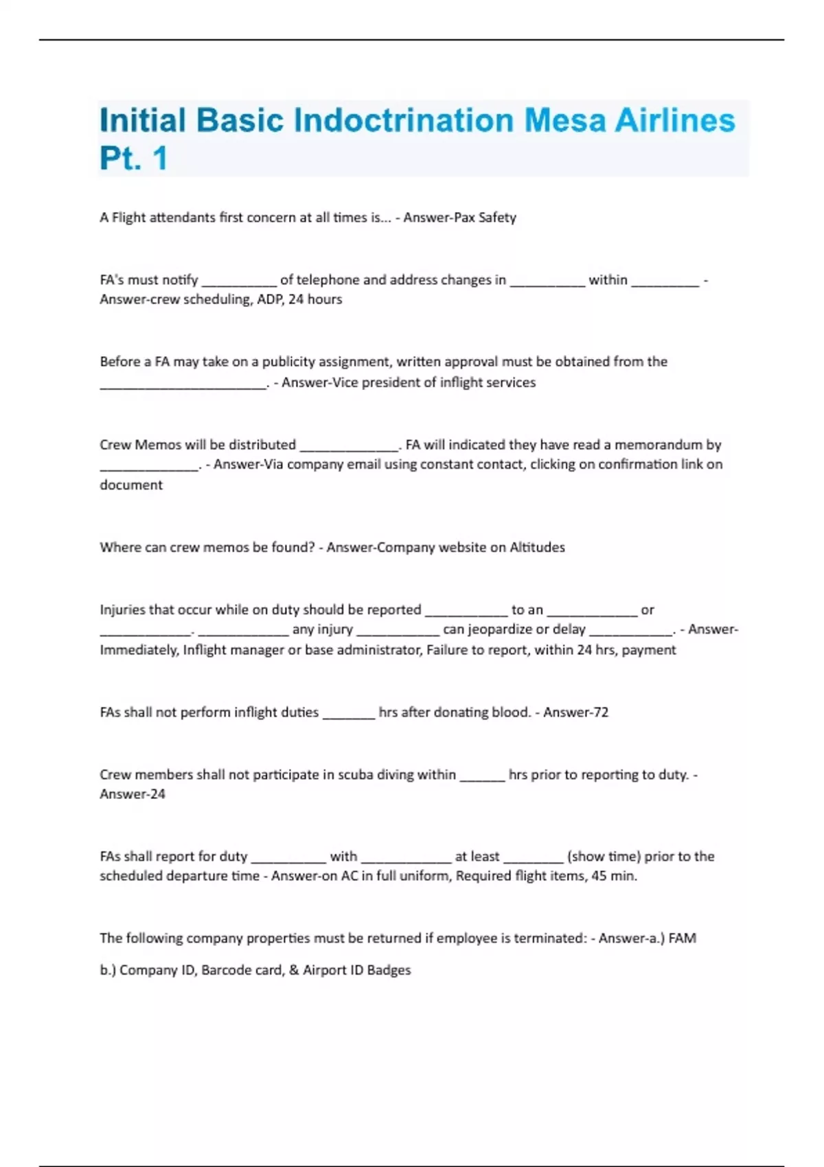 A Flight attendants first concern at all times is... - Answer-Pax Safety FA's must notify __________ of telephone and address changes in __________ within _________ - Answer-crew scheduling, ADP, 24 hours Before a FA may take on a publicity assignment, written approval must be obtained from the ______________________. - Answer-Vice president of inflight services Crew Memos will be distributed _____________. FA will indicated they have read a memorandum by _____________. - Answer-Via company email using constant contact, clicking on confirmation link on document Where can crew memos be found? - Answer-Company website on Altitudes Injuries that occur while on duty should be reported ___________ to an ____________ or ____________. ____________ any injury ___________ can jeopardize or delay ___________. - AnswerImmediately, Inflight manager or base administrator, Failure to report, within 24 hrs, payment FAs shall not perform inflight duties _______ hrs after donating blood. - Answer-72 Crew members shall not participate in scuba diving within ______ hrs prior to reporting to duty. - Answer-24 FAs shall report for duty __________ with ____________ at least ________ (show time) prior to the scheduled departure time - Answer-on AC in full uniform, Required flight items, 45 min. The following company properties must be returned if employee is terminated: - Answer-a.) FAM b.) Company ID, Barcode card, & Airport ID Badgesc.) Parking Pass d.) carry-on bag Program (Manual 195) e.) Exit seat program (manual 109) Who is responsible for updating the FA manual? - Answer-Manual Owner To become an IOE instructor you must have __ months of flight attendant experience. - Answer-6 months While in uniform, FAs should always consider behavior in terms of how it is seen by others: a.) avoid ____________ in public areas b.) do not sit in _________ or on __________. c.) never wear _________. d.) Tattoos and body piercings must be __________. (Exception: Females may wear one pair of earrings no larger than one inch in diameter.) e.) Do not sit ___________ during flight unless ____________. f.) Do not ask ___________. Professionalism while on duty is expected at all times. - Answer-a.) small talk, disputes, reproaches, controversial discussions & company business in open areas. b.) Wheelchairs, Electronic carts c.) Headsets/ earphones d.) Concealed at all times e.) on armrests or PAX seats, Jumpseat is INOP f.) PAX or others in airport personal questions The IOE will consist of at least ________, followed by ________. - Answer-5 hrs, one flight competency check ride FAs are not permitted to accept a scheduled duty period longer than ________ hrs in any 24 consecutive hrs. Each FA shall be relieved from all duty for at least ______ at least once during any __________. FAs must be given a rest period of at least ______ consecutive hrs. - Answer-14, 24, 7, 9When is the FA required to complete recurrent? - Answer-each calendar year (in the calendar month before or after the month in which it is required) Are the following permitted while in uniform? a.) Sitting on atlas bins Y/N b.) Wearing headsets or earphones Y/N c.) Reading while on duty (except as necessary for duty) Y/N d.) Smoking in designated areas Y/N e.) Sleeping or giving the appearance of sleeping in cabin while on duty or in view of PAX Y/N f.) Chewing Gum Y/N g.) Wearing sunglasses outside Y/N h.) Non- conservative eyewear Y/N i.) Entering a liquor store or consuming liquor Y/N - Answer-a.) N b.) N c.) N d.) Y e.) N f.) N g.) Y h.) N i.) N list all required items - Answer-1. FAM (610) 2. Carry on baggage program (195) 3. exit seat program (190) 4. Flight Attendant Certification (FAA) 5. Airport ID (if applicable) & Mesa Airlines, inc. Badge 6. pen 7. passport8. workable wrist watch 9. operable flashlight The Cabin Incident Report (CIR) must be filled out when an _____________ occurs __________________. - Answer-irregularity or discrepancy, on the ground or in flight while on duty