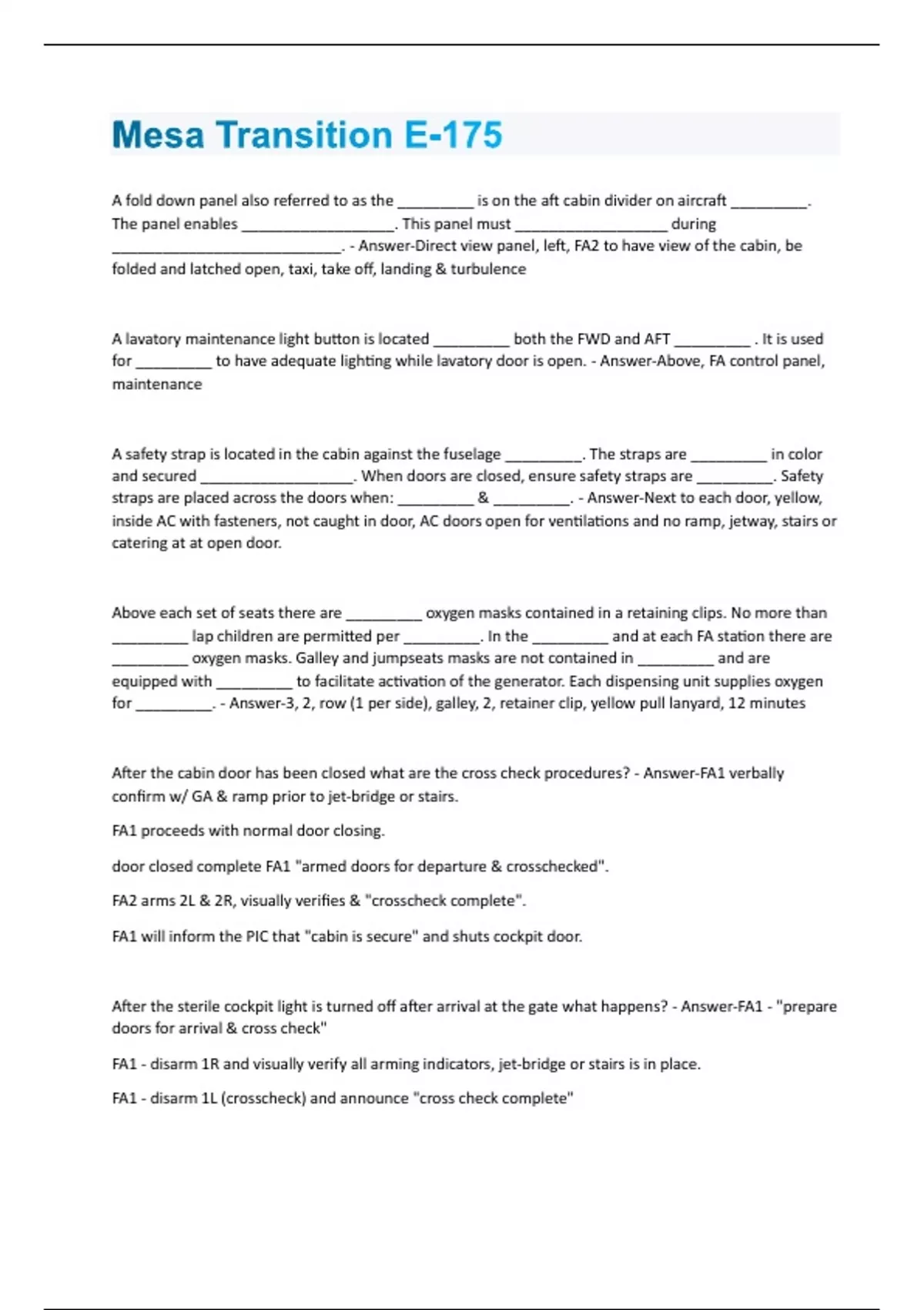 A fold down panel also referred to as the _________ is on the aft cabin divider on aircraft _________. The panel enables __________________. This panel must __________________ during ___________________________. - Answer-Direct view panel, left, FA2 to have view of the cabin, be folded and latched open, taxi, take off, landing & turbulence A lavatory maintenance light button is located _________ both the FWD and AFT _________ . It is used for _________ to have adequate lighting while lavatory door is open. - Answer-Above, FA control panel, maintenance A safety strap is located in the cabin against the fuselage _________. The straps are _________ in color and secured __________________. When doors are closed, ensure safety straps are _________. Safety straps are placed across the doors when: _________ & _________. - Answer-Next to each door, yellow, inside AC with fasteners, not caught in door, AC doors open for ventilations and no ramp, jetway, stairs or catering at at open door. Above each set of seats there are _________ oxygen masks contained in a retaining clips. No more than _________ lap children are permitted per _________. In the _________ and at each FA station there are _________ oxygen masks. Galley and jumpseats masks are not contained in _________ and are equipped with _________ to facilitate activation of the generator. Each dispensing unit supplies oxygen for _________. - Answer-3, 2, row (1 per side), galley, 2, retainer clip, yellow pull lanyard, 12 minutes After the cabin door has been closed what are the cross check procedures? - Answer-FA1 verbally confirm w/ GA & ramp prior to jet-bridge or stairs. FA1 proceeds with normal door closing. door closed complete FA1 "armed doors for departure & crosschecked". FA2 arms 2L & 2R, visually verifies & "crosscheck complete". FA1 will inform the PIC that "cabin is secure" and shuts cockpit door. After the sterile cockpit light is turned off after arrival at the gate what happens? - Answer-FA1 - "prepare doors for arrival & cross check" FA1 - disarm 1R and visually verify all arming indicators, jet-bridge or stairs is in place. FA1 - disarm 1L (crosscheck) and announce "cross check complete"FA1 - give GA thumbs up through pothole and stand clear of door handle as door opens. All electronic devices in 1st class must be unplugged during ________ & ________ - Answer-Take off and landing Describe the operation of the water fire extinguisher. - Answer-Turn handle fully clockwise Aim at base of flame Press lever on tope of extinguishers Sweep FA1 may set the passenger cabin temperature between __________________. The _________ indicator must be illuminated _________ in order for the flight attendant to adjust cabin temperature. - Answer- 65°-85° F, enabled, by the cockpit First class seats have built in _________. This is for _________ ONLY. FA's _________ use this __________________. - Answer-Powers stations, PAX use, may not , while passengers are on board How do you reset the PSU button? - Answer-Push reset button How does the FA open the doors in emergency mode? - Answer-Assess outside & grasp main cabin door then lift up. Grasp assist handle and push out. Move handle to full up to release nitrogen actuator. Maintain grasp on assist handle & pull red inflation. Continue grasp & proceed evacuation. How is the cockpit window used in an emergency? - Answer-While pressing lock button pull handle in and backwards. Use escape rope. While holding assist handle & rope step on seat & climb out.If a drain becomes clogged or fluid drainage is becoming too slow, __________________. In case of a clog in the LAV or galley, the FA _________ to clear the drain. The galleys contain a remote actuation cable located __________________. Access to the lavatory valve is through the __________________. The valve is cleared by pulling on the _________ - Answer-No more fluids are to be disposed, may actuate valve, on the face of the galley for easy access, the cabinet door under sink, ring handle If smoke/fire is detected in either lavatory: - Answer-Alarm sound in LAV where detected. Flashing orange light on call panel will give visual indication from LAV where detected. If the doors are opened from the outside, does the slide deploy? - Answer-No If the passenger oxygen system is activated and the compartment does not automatically open the mask may be dropped by using _________ located _________ & __________________. - Answer-MRT (Manual release tool), FWD & AFT stations In a water landing the slides are designed to be ________________ in order to be used as a floatation device. When must it be detached from the aircraft? ________________________________. - AnswerDetached from the aircraft. When the door opens in emergency mode. In the event of an emergency evacuation, the slides _________ when the exit door is _________. - Answer-Deploy automatically, armed and open Passenger seating consists of _________ rows numbered _________. there are no rows __________________. - Answer-20, 1-24, 5, 6, 13, 14 Preflgiht the water fire extinguisher. - Answer-Water seal intact Handle contains CO2 cartridge Present & secure Preflight the cabin doors? - Answer-Slide gauge pointer is with in green band. Door arming lever in full up position. Escape slide indicator is green disarmed.Girt bar indicator is clear. Prior to playing the verification announcement on the PRA, what must the FA1 say? - Answer-Good morining/afternoon/evening ladies and gentlemen, we would like to confirm this is flight #________ with service to ________..... The "cross check complete" announcement after arrival cannot be made until the __________________ and ___________________________. The FA must also ensure the girt bar indicator on the bottom left of the door_________. - Answer-door is disarmed, & visually verifies arming indicators, clear