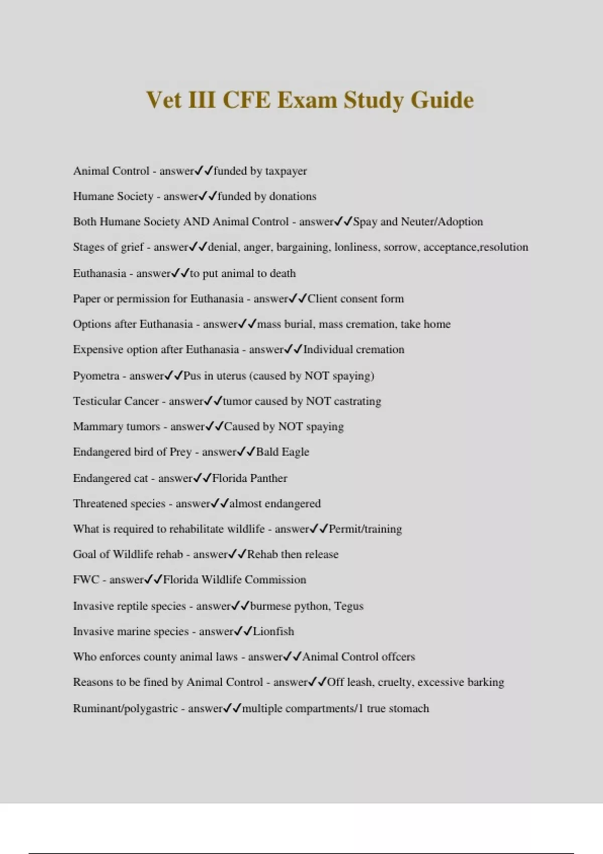 Vet III CFE Exam Study Guide Animal Control - answerfunded by taxpayer Humane Society - answerfunded by donations Both Humane Society AND Animal Control - answerSpay and Neuter/Adoption Stages of grief - answerdenial, anger, bargaining, lonliness, sorrow, acceptance,resolution Euthanasia - answerto put animal to death Paper or permission for Euthanasia - answerClient consent form Options after Euthanasia - answermass burial, mass cremation, take home Expensive option after Euthanasia - answerIndividual cremation Pyometra - answerPus in uterus (caused by NOT spaying) Testicular Cancer - answertumor caused by NOT castrating Mammary tumors - answerCaused by NOT spaying Endangered bird of Prey - answerBald Eagle Endangered cat - answerFlorida Panther Threatened species - answeralmost endangered What is required to rehabilitate wildlife - answerPermit/training Goal of Wildlife rehab - answerRehab then release FWC - answerFlorida Wildlife Commission Invasive reptile species - answerburmese python, Tegus Invasive marine species - answerLionfish Who enforces county animal laws - answerAnimal Control offcers Reasons to be fined by Animal Control - an