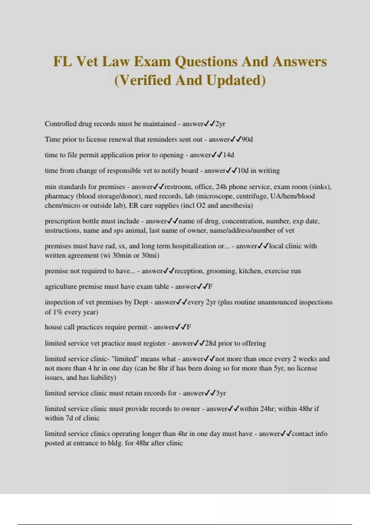 FL Vet Law Exam Questions And Answers (Verified And Updated) Controlled drug records must be maintained - answer2yr Time prior to license renewal that reminders sent out - answer90d time to file permit application prior to opening - answer14d time from change of responsible vet to notify board - answer10d in writing min standards for premises - answerrestroom, office, 24h phone service, exam room (sinks), pharmacy (blood storage/donor), med records, lab (microscope, centrifuge, UA/hem/blood chem/micro or outside lab), ER care supplies (incl O2 and anesthesia) prescription bottle must include - answername of drug, concentration, number, exp date, instructions, name and sps animal, last name of owner, name/address/number of vet premises must have rad, sx, and long term hospitalization or... - answerlocal clinic with written agreement (wi 30min or 30mi) premise not required to have... - answerreception, grooming, kitchen, exercise run agriculture premise must have exam table - answerF inspection of vet premises by Dept - answerevery 2yr (plus routine unannounced inspections of 1% every year) house call practices require permit - answerF limited service vet practice must register - answer28d prior to offering limited service clinic- "limited" means what - answernot more than once every 2 weeks and not more than 4 hr in one day (can be 8hr if has been doing so for more than 5yr, no license issues, and has liability) limited service clinic must retain records for - answer3yr limited service clinic must provide records to owner - answerwithin 24hr; within 48hr if within 7d of clinic limited service clinics operating longer than 4hr in one day must have - answercontact info posted at entrance to bldg. for 48hr after clinic