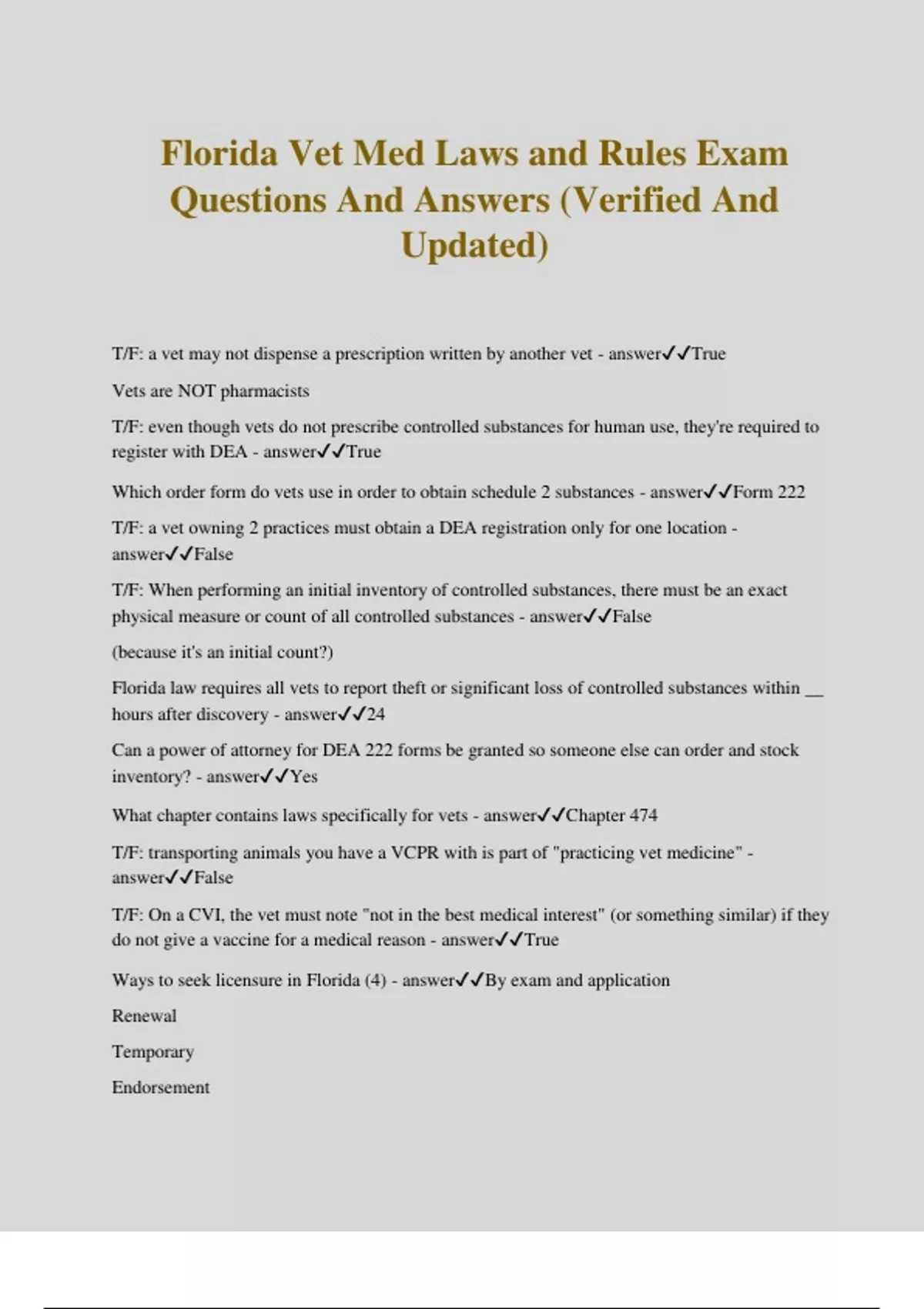 Florida Vet Med Laws and Rules Exam Questions And Answers (Verified And Updated) T/F: a vet may not dispense a prescription written by another vet - answerTrue Vets are NOT pharmacists T/F: even though vets do not prescribe controlled substances for human use, they're required to register with DEA - answerTrue Which order form do vets use in order to obtain schedule 2 substances - answerForm 222 T/F: a vet owning 2 practices must obtain a DEA registration only for one location - answerFalse T/F: When performing an initial inventory of controlled substances, there must be an exact physical measure or count of all controlled substances - answerFalse (because it's an initial count?) Florida law requires all vets to report theft or significant loss of controlled substances within __ hours after discovery - answer24 Can a power of attorney for DEA 222 forms be granted so someone else can order and stock inventory? - answerYes What chapter contains laws specifically for vets - answerChapter 474 T/F: transporting animals you have a VCPR with is part of "practicing vet medicine" - answerFalse T/F: On a CVI, the vet must note "not in the best medical interest" (or something similar) if they do not give a vaccine for a medical reason - answerTrue Ways to seek licensure in Florida (4) - answerBy exam and application Renewal Temporary Endorsement How many hours of CE hours does a vet need every biennium - answer30 The board of vet med has how many members - answer7 5 vets and 2 regular people T/F: all premises must have facilities for radiology, surgery, and long-term hospitalization - answerFalse Must provide clients info to hospitals with these services if you don't have When should a patient record be created - answerAs you provide treatment or within 24 hours of treatment Can records be withheld from a client if they don't pay the cost of duplication - answerYes Which diseases can only a vet treat an animal for (4) - answerBrucellosis Tuberculosis Rabies Equine encephalomyelitis What tasks can be performed by a vet staff without the licensed vet on premise - answerAdmin of meds and treatment (not vaccines) Getting samples and running diagnostic tests T/F: a vet can report a suspected criminal violation to law enforcement without telling the client for companion animals - answerTrue T/F: a vet can report a suspected criminal violation to law enforcement without telling the client for commercial food-producing animal operations - answerFalse What are the 2 instances a vet can use a temporary license - answer1. Treating animals of a specific owner named on the license 2. Emergency How long is a temporary license good for - answer30 days If you violate a law in Chapter 474, what is your sentence - answerFelony of the third degree What is the maximum fine you can receive as a penalty for laws in chapter 474 - answer$5000 T/F: the department can issue a subpoena for the info of a vets clients if there's a complaint against them - answerTrue