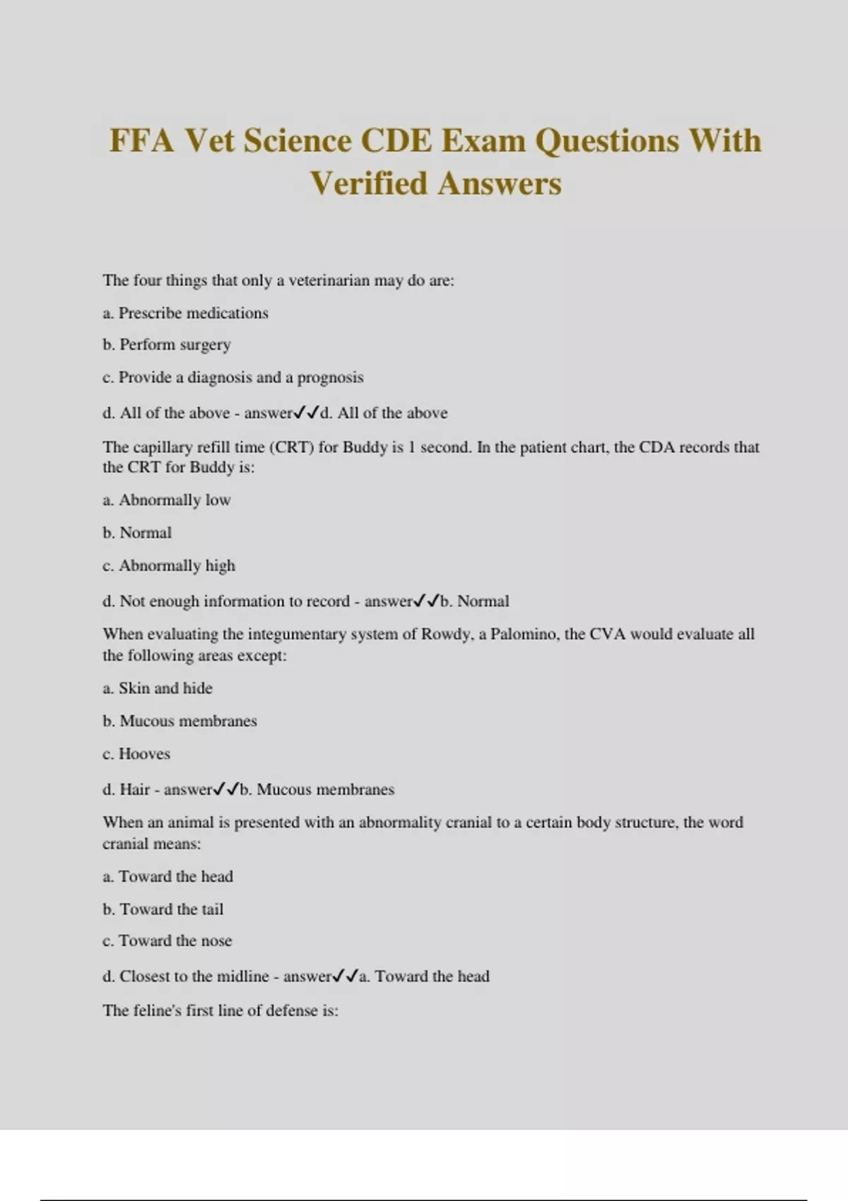 FFA Vet Science CDE Exam Questions With Verified Answers The four things that only a veterinarian may do are: a. Prescribe medications b. Perform surgery c. Provide a diagnosis and a prognosis d. All of the above - answerd. All of the above The capillary refill time (CRT) for Buddy is 1 second. In the patient chart, the CDA records that the CRT for Buddy is: a. Abnormally low b. Normal c. Abnormally high d. Not enough information to record - answerb. Normal When evaluating the integumentary system of Rowdy, a Palomino, the CVA would evaluate all the following areas except: a. Skin and hide b. Mucous membranes c. Hooves d. Hair - answerb. Mucous membranes When an animal is presented with an abnormality cranial to a certain body structure, the word cranial means: a. Toward the head b. Toward the tail c. Toward the nose d. Closest to the midline - answera. Toward the head The feline's first line of defense is: a. Its teeth b. Its claws c. Its tail d. Its hind legs - answerb. Its claws You are restraining a Besenji dog for cephalic venipuncture. When the person performing the injection has placed the needle and is ready to inject the drug, he says to you, "Okay." He is most likely asking you to: a. Verbally indicate that he has made contact with the vein b. Lift the thumb that is occluding the vein c. Release the animal from restraint d. Roll the vein in the opposite direction - answerb. Lift the thumb that is occluding the vein Use the following scenario to answer the next two questions. An otherwise healthy veterinary technician, Anna, is bitten by a 2-year-old mixed-breed dog, "Tow Tow," while restraining him for a pedicure. The bite does not cause severe tissue damage, but the canine teeth penetrate her skin and she does bleed. Tow Tow is current on all of his vaccinations including rabies. He lives primarily in the backyard of his owner's suburban home. What is the best, first action Anna should take following the bite? a. Ignore the bite until she has time to wash it, even though this may not be for a few hours. Once there is time, also inform the veterinarian or office manager. b. Wash the wound immediately with soap and water, then with povidone-iodine, and follow with a thorough irrigation with water, then inform the veterinarian or office manager. c. Wait until she gets home and clean the wound, without notifying the veterinarian b - answerb. Wash the wound immediately with soap and water, then with povidone-iodine, and follow with a thorough irrigation with water, then inform the veterinarian or office manager. Anemia is: a. The study of parasites. b. A single celled animal. c. A decrease in the number of red blood cells. d. A disease that can be transmitted from animals to humans. - answerc. A decrease in the number of red blood cells. Pericardium is: a. The muscular layer of the heart wall. b. The fibrous sac that encloses the heart. c. A thin layer that lines the surface of the heart. d. A thin layer that lines the inside of the heart. - answerb. The fibrous sac that encloses the heart. A compound fracture is one in which: a. The break is along the axis of a bone. b. The bone shatters in the many pieces. c. The break is on one side of the bone. d. The bone breaks through the skin. - answerd. The bone breaks through the skin. An orchiectomy: a. Removal of the ovaries and uterus. b. Removal of the testes. c. An incision into the thorax. d. Removal of a tumor. - answerb. Removal of the testes. Microfilaria are: a. The larval stage of the heartworm. b. The segment of the tapeworm containing the male and female reproductive organs. c. Microscopic single celled organisms. d. None of the above. - answera. The larval stage of the heartworm. The abomasum is: a.The first compartment of the ruminant stomach. b.The second compartment of the ruminant stomach. c.The third compartment of the ruminant stomach. d.The fourth compartment of the ruminant stomach. - answerd. The fourth compartment of the ruminant stomach. The function of the cecum is to: a. Produce bile. b. Aide in the digestion of fibrous materials.