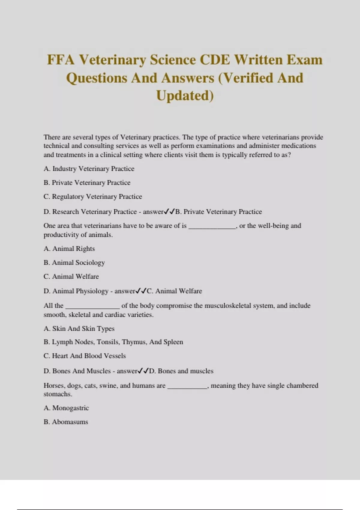 FFA Veterinary Science CDE Written Exam Questions And Answers (Verified And Updated) There are several types of Veterinary practices. The type of practice where veterinarians provide technical and consulting services as well as perform examinations and administer medications and treatments in a clinical setting where clients visit them is typically referred to as? A. Industry Veterinary Practice B. Private Veterinary Practice C. Regulatory Veterinary Practice D. Research Veterinary Practice - answerB. Private Veterinary Practice One area that veterinarians have to be aware of is _____________, or the well-being and productivity of animals. A. Animal Rights B. Animal Sociology C. Animal Welfare D. Animal Physiology - answerC. Animal Welfare All the _______________ of the body compromise the musculoskeletal system, and include smooth, skeletal and cardiac varieties. A. Skin And Skin Types B. Lymph Nodes, Tonsils, Thymus, And Spleen C. Heart And Blood Vessels D. Bones And Muscles - answerD. Bones and muscles Horses, dogs, cats, swine, and humans are ___________, meaning they have single chambered stomachs. A. Monogastric B. Abomasums C. Ruminant D. Reticulums - answerA. Monogastric Which one of the following is NOT a vital sign that can be monitored by veterinarians? A.Body temperature B.Pulse rate C.Surrounding climate D.Respiration date - answerC. Surrounding climate The phases known as interphase, prophase, and anaphase are all part of the process of ____________, or cell division. A. Mitosis B. Transcription C. Translation D. Meosis - answerD. Meiosis If a veterinarian does not know the exact age of the animal, the most widely employed method is to exams the animal's __________? A. Hooves B. Condition C. Teeth D. Hair Coat - answerC. Teeth Dog breeds are categorized in groups that have certain distinguishing characteristics in common. Which of the following is NOT a commonly recognized dog breed group according to the American Kennel Club? A. Non-Working Dogs B. Hounds C. Sporting Dogs D. Non-Sporting Dogs - answerA. Non-Working Dogs Protein is essential for normal growth, development and maintenance of an animal. Which of the following is an example of a source where animal protein could come from? A. Cottonseed
