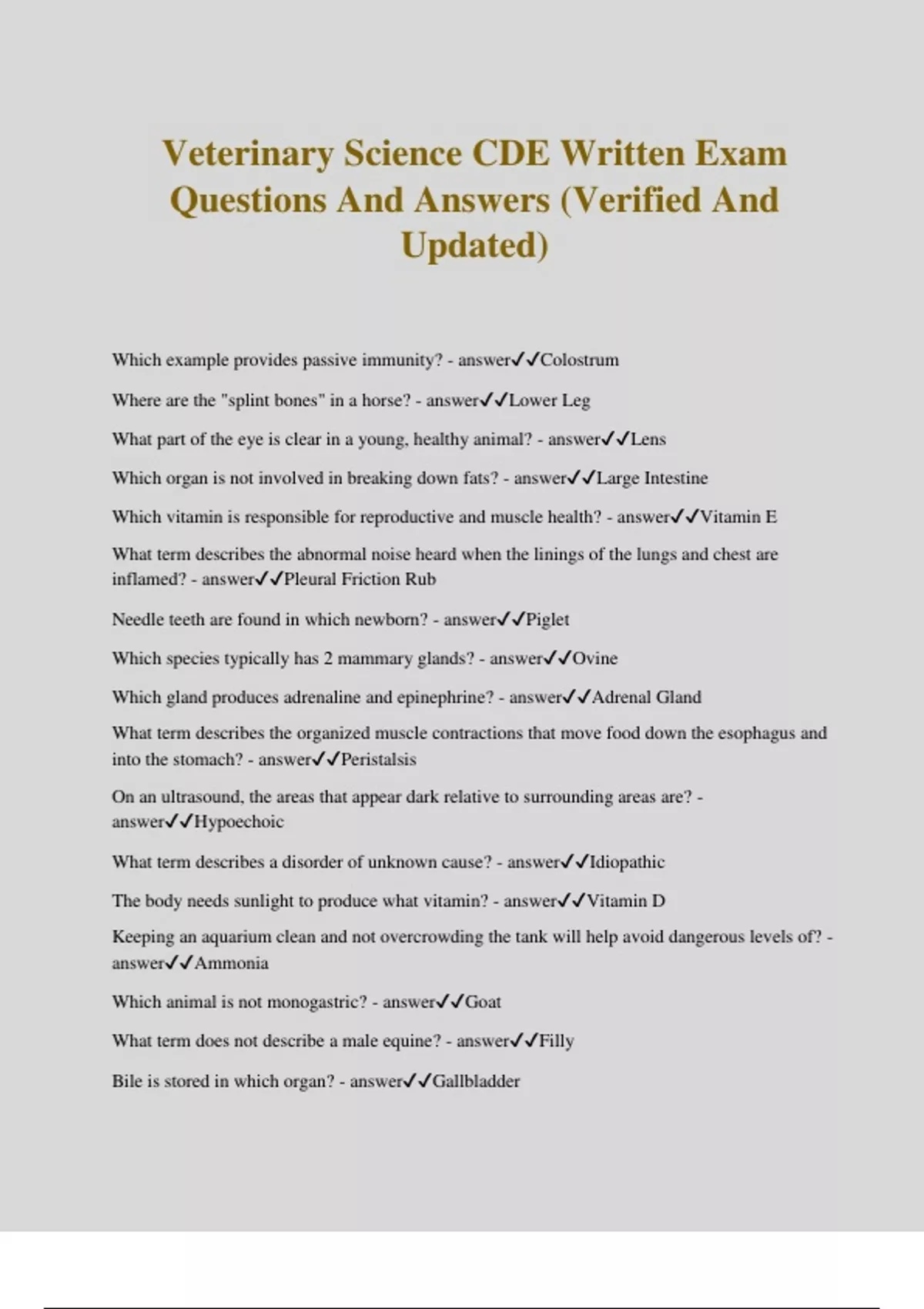 Veterinary Science CDE Written Exam Questions And Answers (Verified And Updated) Which example provides passive immunity? - answerColostrum Where are the "splint bones" in a horse? - answerLower Leg What part of the eye is clear in a young, healthy animal? - answerLens Which organ is not involved in breaking down fats? - answerLarge Intestine Which vitamin is responsible for reproductive and muscle health? - answerVitamin E What term describes the abnormal noise heard when the linings of the lungs and chest are inflamed? - answerPleural Friction Rub Needle teeth are found in which newborn? - answerPiglet Which species typically has 2 mammary glands? - answerOvine Which gland produces adrenaline and epinephrine? - answerAdrenal Gland What term describes the organized muscle contractions that move food down the esophagus and into the stomach? - answerPeristalsis On an ultrasound, the areas that appear dark relative to surrounding areas are? - answerHypoechoic What term describes a disorder of unknown cause? - answerIdiopathic The body needs sunlight to produce what vitamin? - answerVitamin D Keeping an aquarium clean and not overcrowding the tank will help avoid dangerous levels of? - answerAmmonia Which animal is not monogastric? - answerGoat What term does not describe a male equine? - answerFilly Bile is stored in which organ? - answerGallbladder