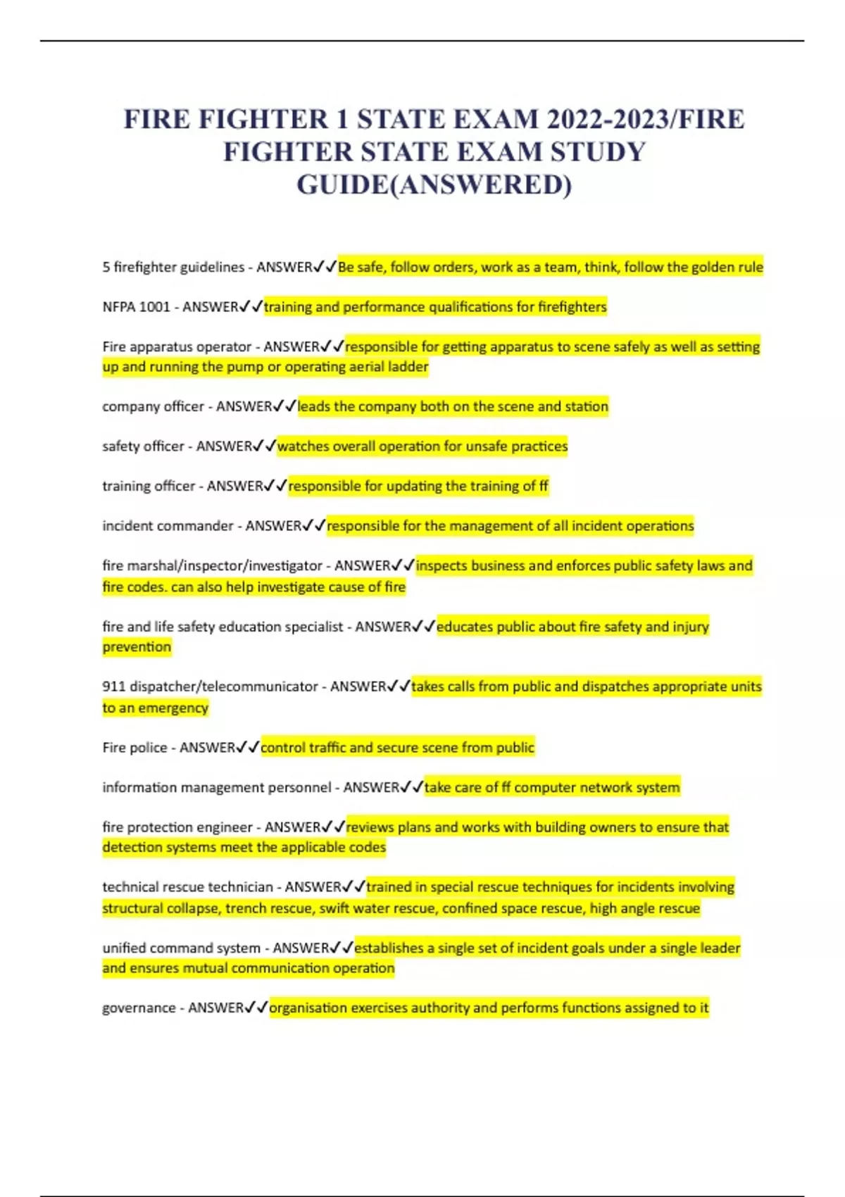 FIRE FIGHTER 1 STATE EXAM /FIRE FIGHTER STATE EXAM STUDY GUIDE(ANSWERED)