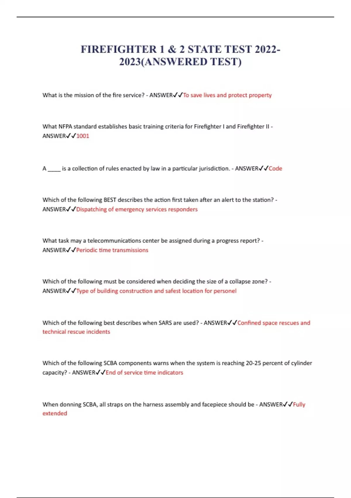 FIREFIGHTER 1 & 2 STATE TEST (ANSWERED TEST)