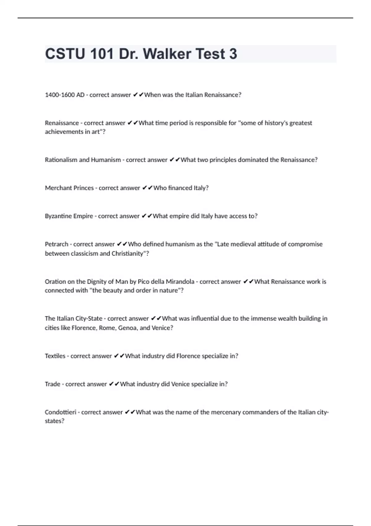CSTU 101 Dr. Walker Test 3 AD - correct answer When was the Italian Renaissance? Renaissance - correct answer What time period is responsible for "some of history's greatest achievements in art"? Rationalism and Humanism - correct answer What two principles dominated the Renaissance? Merchant Princes - correct answer Who financed Italy? Byzantine Empire - correct answer What empire did Italy have access to? Petrarch - correct answer Who defined humanism as the "Late medieval attitude of compromise between classicism and Christianity"? Oration on the Dignity of Man by Pico della Mirandola - correct answer What Renaissance work is connected with "the beauty and order in nature"? The Italian City-State - correct answer What was influential due to the immense wealth building in cities like Florence, Rome, Genoa, and Venice? Textiles - correct answer What industry did Florence specialize in? Trade - correct answer What industry did Venice specialize in? Condottieri - correct answer What was the name of the mercenary commanders of the Italian city-states?