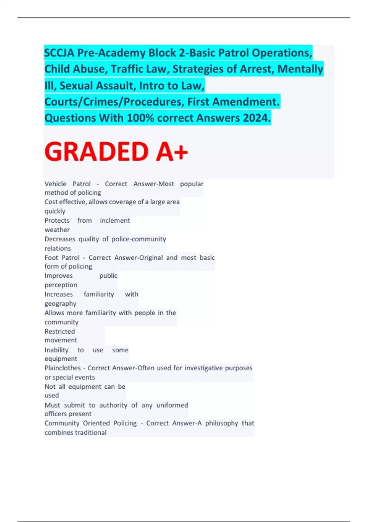 SCCJA Pre-Academy Block 2-Basic Patrol Operations, Child Abuse, Traffic Law, Strategies of Arrest, Mentally Ill, Sexual Assault, Intro to Law, Courts/Crimes/Procedures, First Amendment. Questions With 100% correct Answers 2024. GRADED A+ Vehicle Patrol - Correct Answer-Most popular method of policing Cost effective, allows coverage of a large area quickly Protects from inclement weather Decreases quality of police-community relations Foot Patrol - Correct Answer-Original and most basic form of policing Improves public perception Increases familiarity with geography Allows more familiarity with people in the community Restricted movement Inability to use some equipment Plainclothes - Correct Answer-Often used for investigative purposes or special events Not all equipment can be used Must submit to authority of any uniformed officers present Community Oriented Policing - Correct Answer-A philosophy that combines traditional aspects of law enforcement with prevention measures, problem-solving, community engagement, and community partnerships Survival Tactics Vital for Foot Patrol Officers - Correct Answer-Always be aware of cover Check buildings before entering Pay attention to nearby vehicles Approach people at a safe distance Use darkness to your advantage Use proper light discipline Wait for backup if necessary Examples of Community Oriented Policing Programs - Correct Answer-Neighborhood Watch Citizen Patrol Scholar - Correct Answer-Always be training on new techniques and tactics-never stop learning Statesman - Correct Answer-Interpersonal communication skills and leadership-ability to keep your head when everyone else is losing theirs Warrior - Correct Answer-Confidence and competence to run towards danger, not because it is easy, but because no one else will Prior to Going In-Service - Correct Answer-Patrol vehicle inspection and search Getting information about previous shift from the officers you're relieving, supervisors, incident reports, investigators, and FI cards Preventative Patrol - Correct Answer-The noticeable presence of police officers and patrol vehicles with the intent of deterring crime Emergency Calls for Service - Correct Answer-Responding to emergency situations such as fires, shootings, hostage incidents, explosions, and suicides Service Calls - Correct Answer-Responding to routine calls for service, citizens who need assistance Public Courtesy Calls - Correct Answer-Escorts-funerals, bank deposits, hospital escorts Locked vehicles Death notifications Vacation checks/patrol requests Proper radio etiquette - Correct Answer-Hold microphone 2-3 inches from the mouth at a 45 degree angle Talk in a normal tone of voice, not too fast or too slow Be actively listening Think about what you say before you say it ABC's of radio communication - Correct Answer-Accuracy-information is accurate and factual Brevity-transmissions are brief and too the point Clarity-all messages are clear, phonetic alphabet used when needed Common radio errors - Correct Answer-Failure to tell dispatch your location Failure to give your location in the proper way Over modulating when calling for help Lost/Missing Person - Correct Answer-A known individual in an unknown location whose safety may be threatened by conditions related to the environment, weather, age, or health Initial Reactions of Lost Persons - Correct Answer-Trail Running