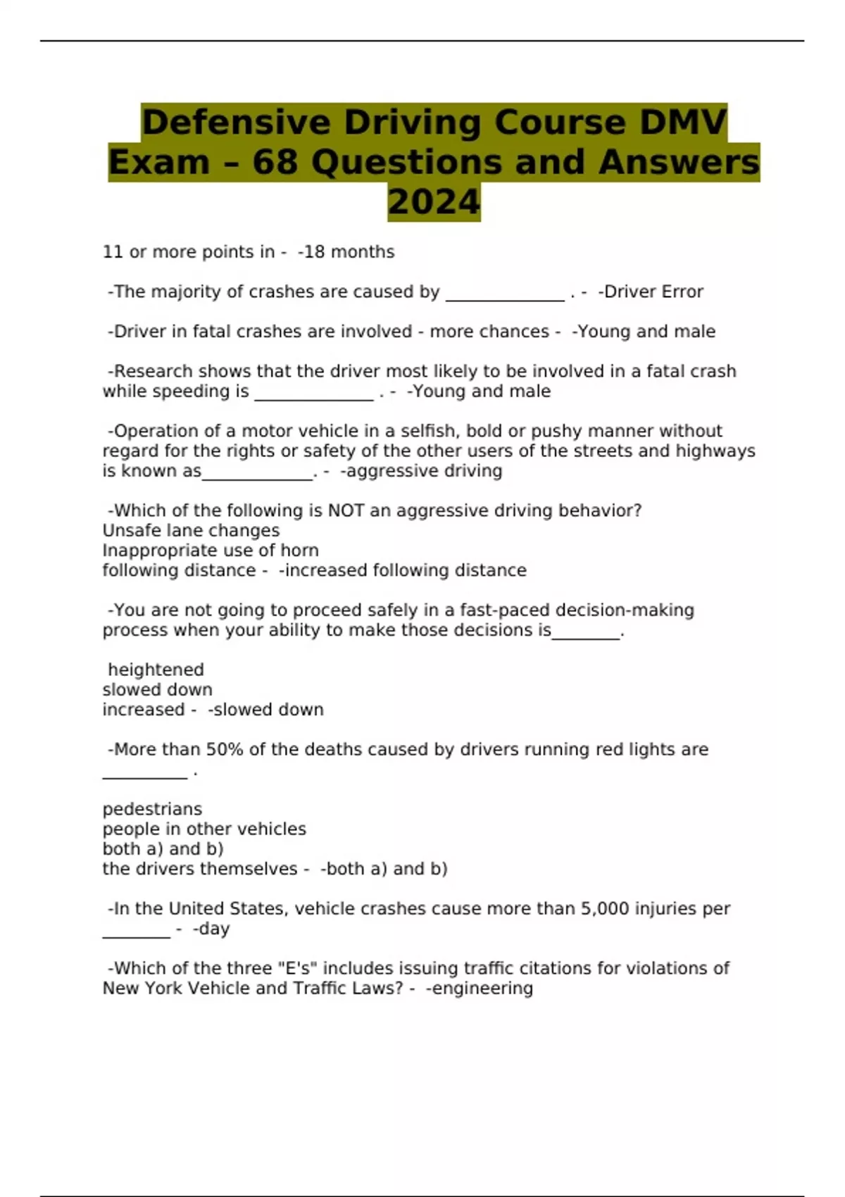 Defensive Driving Course DMV Exam – 68 Questions and Answers 2024