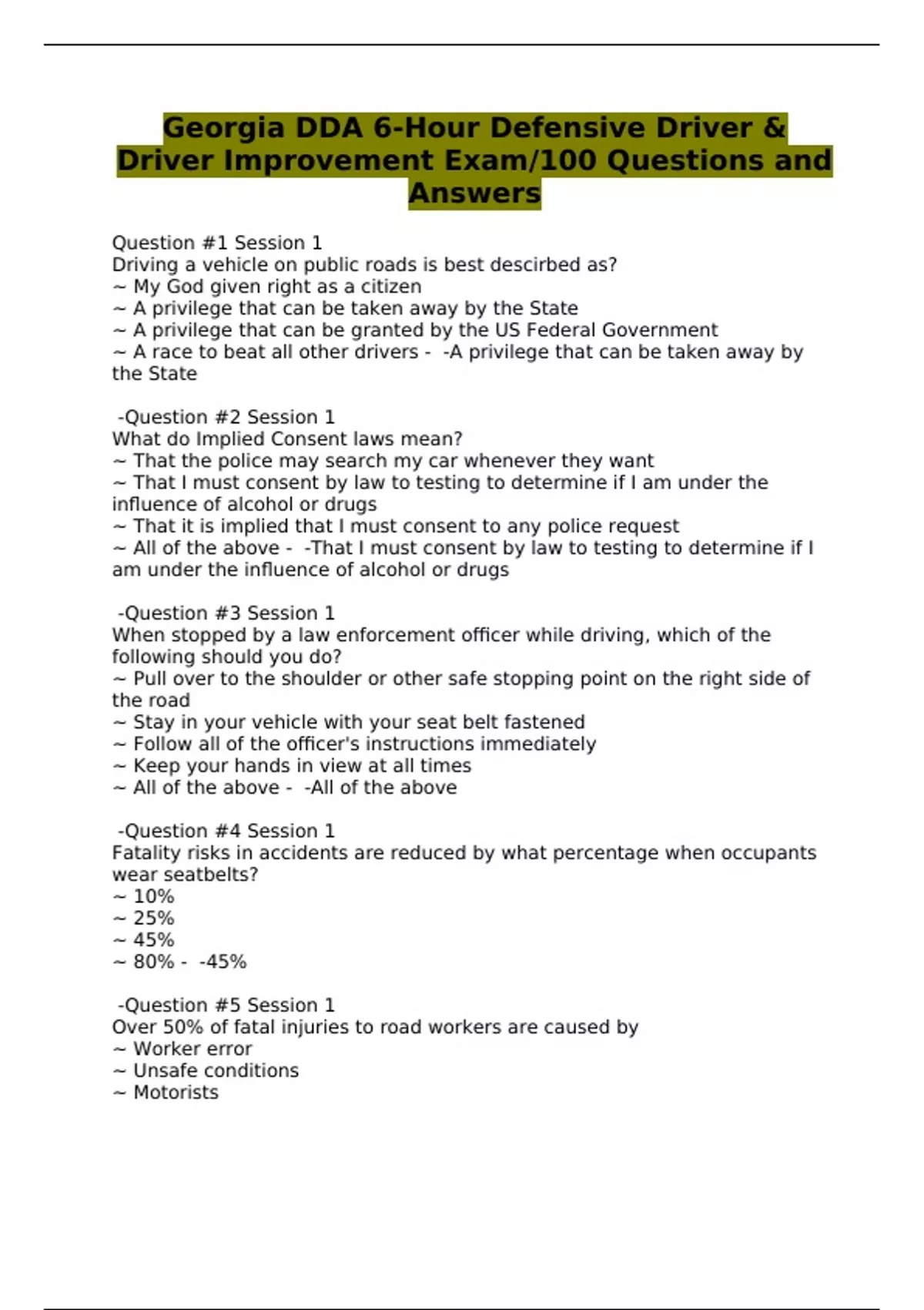 Georgia DDA 6-Hour Defensive Driver & Driver Improvement Exam/100 Questions and Answers