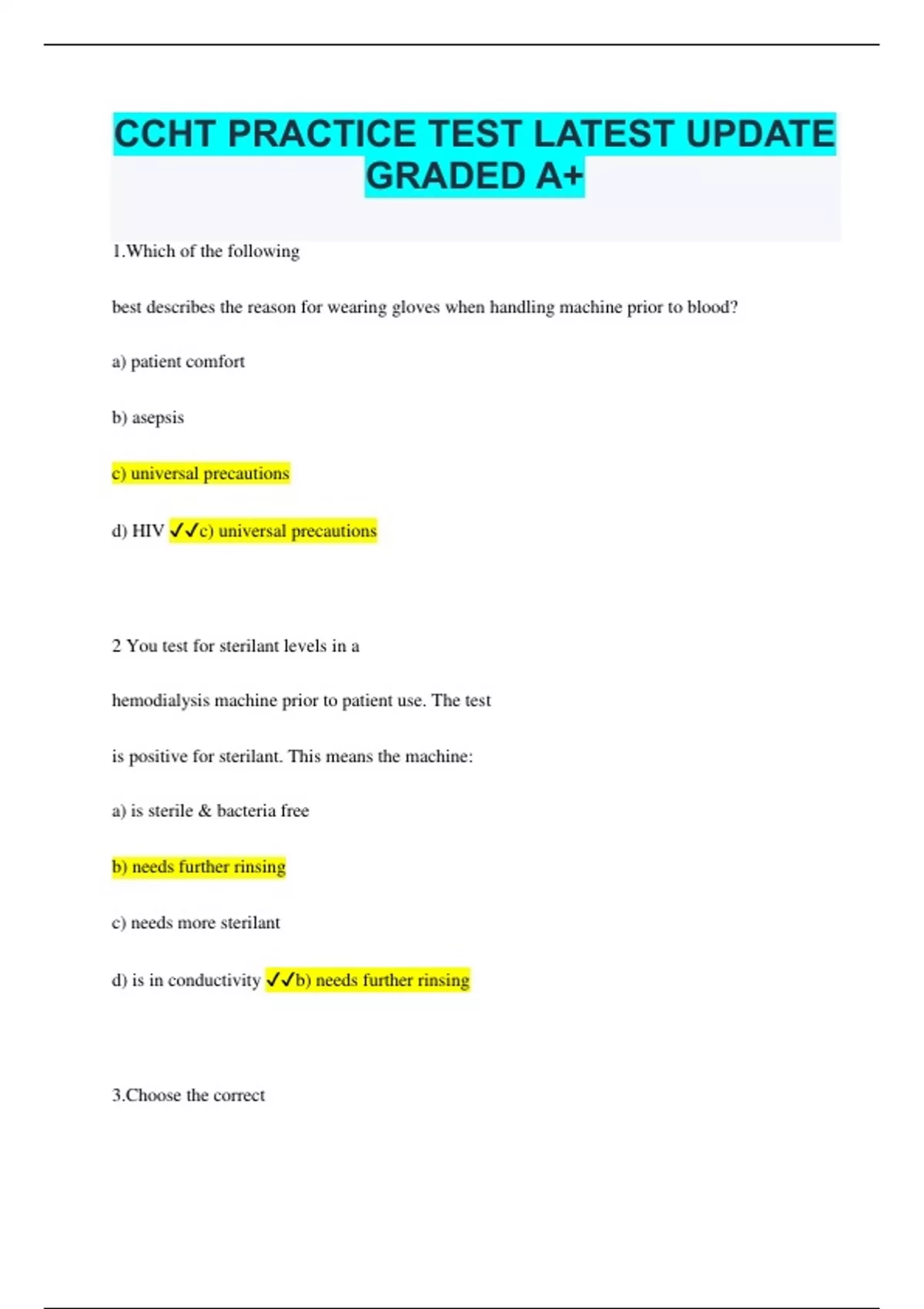 1.Which of the following best describes the reason for wearing gloves when handling machine prior to blood? a) patient comfort b) asepsis c) universal precautions d) HIV c) universal precautions 2 You test for sterilant levels in a hemodialysis machine prior to patient use. The test is positive for sterilant. This means the machine: a) is sterile & bacteria free b) needs further rinsing c) needs more sterilant d) is in conductivity b) needs further rinsing 3.Choose the correctstatement regarding serum abnormalities in renal failure: a) creatinine, BUN, & phosphorus are elevated b) creatinine BUN creatinine, BUN, & phosphorus are depressed c) calcium & bicarbonate are elevated d) calcium & bicarbonate are depressed a) creatinine, BUN, & phosphorus are elevated 4.Hemodialysis requires a means to channel the patient's blood to the hemodialyzer & then back to the body. It's called:a) vascular access