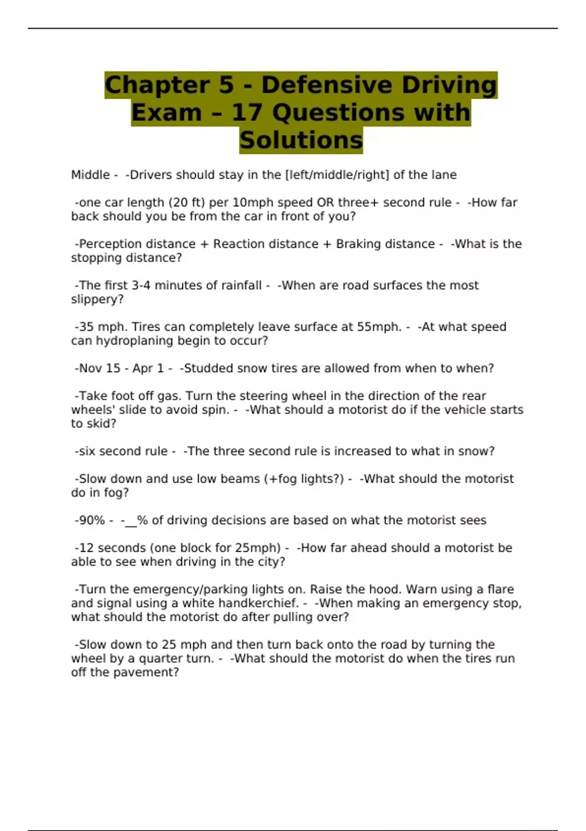 Chapter 5 - Defensive Driving Exam – 17 Questions with Solutions