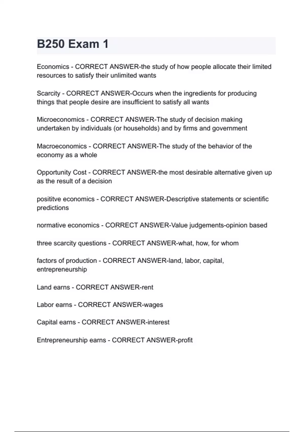 factors of production - CORRECT ANSWER-land, labor, capital,