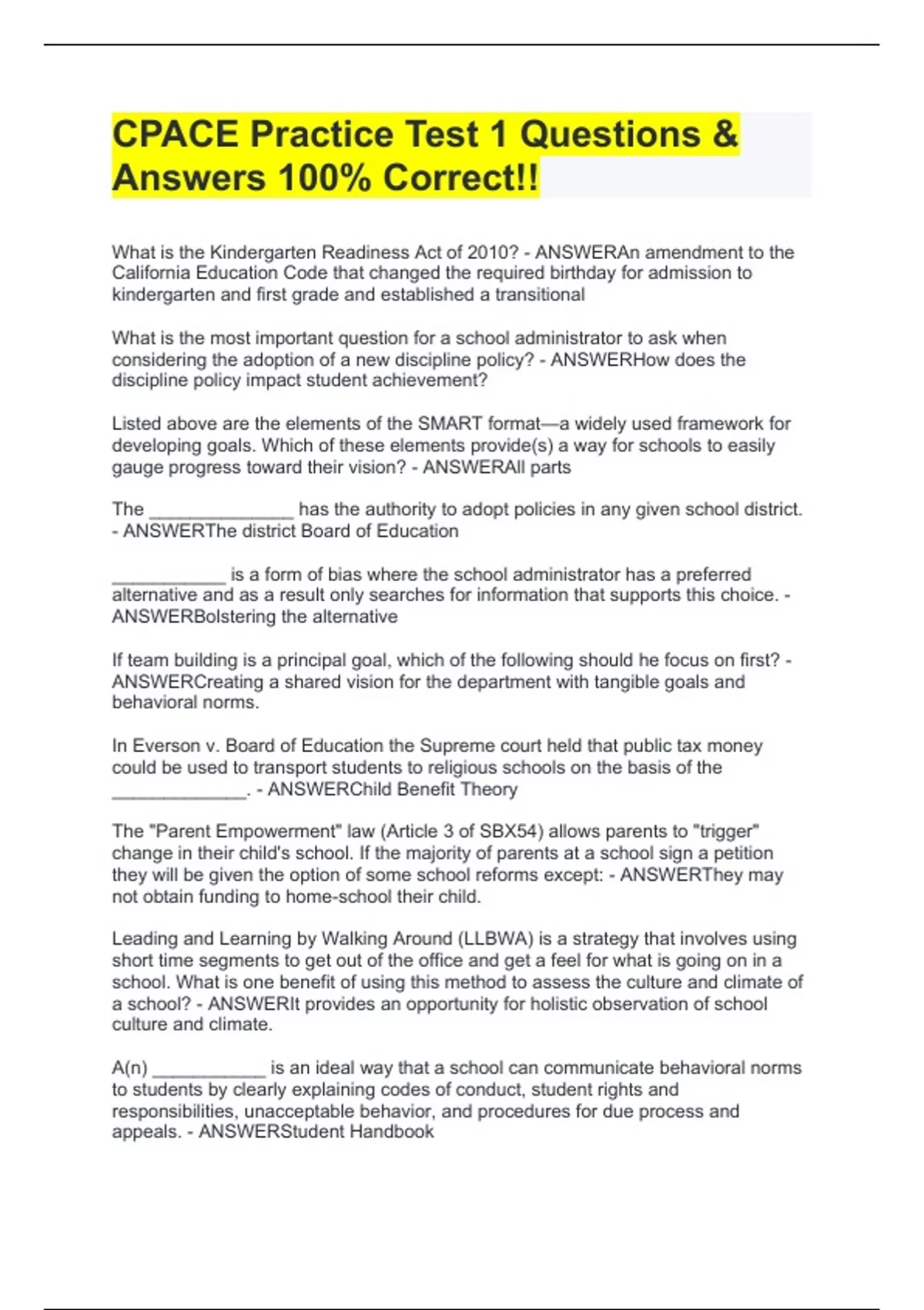 cpace practice test 1 questions answers 100 cor