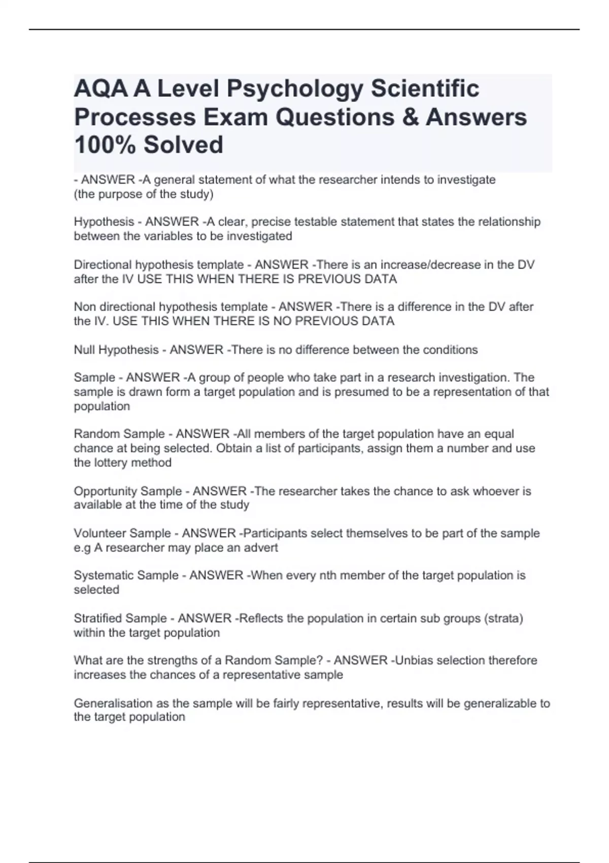 - ANSWER -A general statement of what the researcher intends to investigate (the purpose of the study) Hypothesis - ANSWER -A clear, precise testable statement that states the relationship between the variables to be investigated Directional hypothesis template - ANSWER -There is an increase/decrease in the DV after the IV USE THIS WHEN THERE IS PREVIOUS DATA Non directional hypothesis template - ANSWER -There is a difference in the DV after the IV. USE THIS WHEN THERE IS NO PREVIOUS DATA Null Hypothesis - ANSWER -There is no difference between the conditions Sample - ANSWER -A group of people who take part in a research investigation. The sample is drawn form a target population and is presumed to be a representation of that population Random Sample - ANSWER -All members of the target population have an equal chance at being selected. Obtain a list of participants, assign them a number and use the lottery method Opportunity Sample - ANSWER -The researcher takes the chance to ask whoever is available at the time of the study Volunteer Sample - ANSWER -Participants select themselves to be part of the sample e.g A researcher may place an advert Systematic Sample - ANSWER -When every nth member of the target population is selected Stratified Sample - ANSWER -Reflects the population in certain sub groups (strata) within the target population What are the strengths of a Random Sample? - ANSWER -Unbias selection therefore increases the chances of a representative sample Generalisation as the sample will be fairly representative, results will be generalizable to the target population What are the weaknesses of a random sample? - ANSWER -It is impractical because random sampling is difficult to achieve as it is sometimes hard to get the details of the target population and not all member may be available or want to take part What are the Strengths of a opportunity sample? - ANSWER -Ease of Formation - Opportunity samples are easy to create as they use people who are readily available Natural experiments - have to use opportunity samples as the researcher has no control over who is studied What are the weaknesses of a opportunity sample? - ANSWER -Unrepresentative - The sample is likely to be biased and thus Unrepresentative so the findings cant be generalised to the target population What are the Strength of a Stratified sample? - ANSWER -Representative as selection occurs from representative sub groups within a population What are the weaknesses of a Stratified sample? - ANSWER -Knowledge of population characteristics is required and it is time consuming What are the Strengths of a Systematic sample? - ANSWER