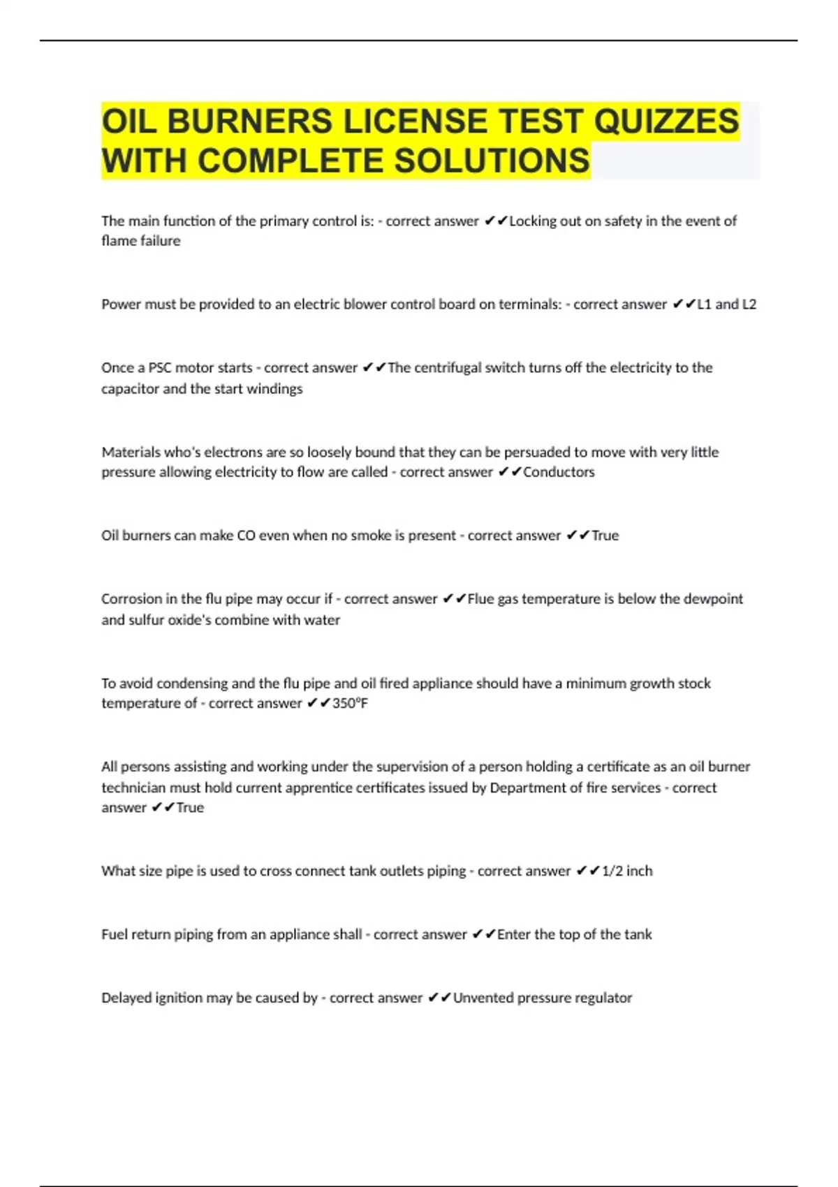 OIL BURNERS LICENSE TEST QUIZZES WITH COMPLETE SOLUTIONS