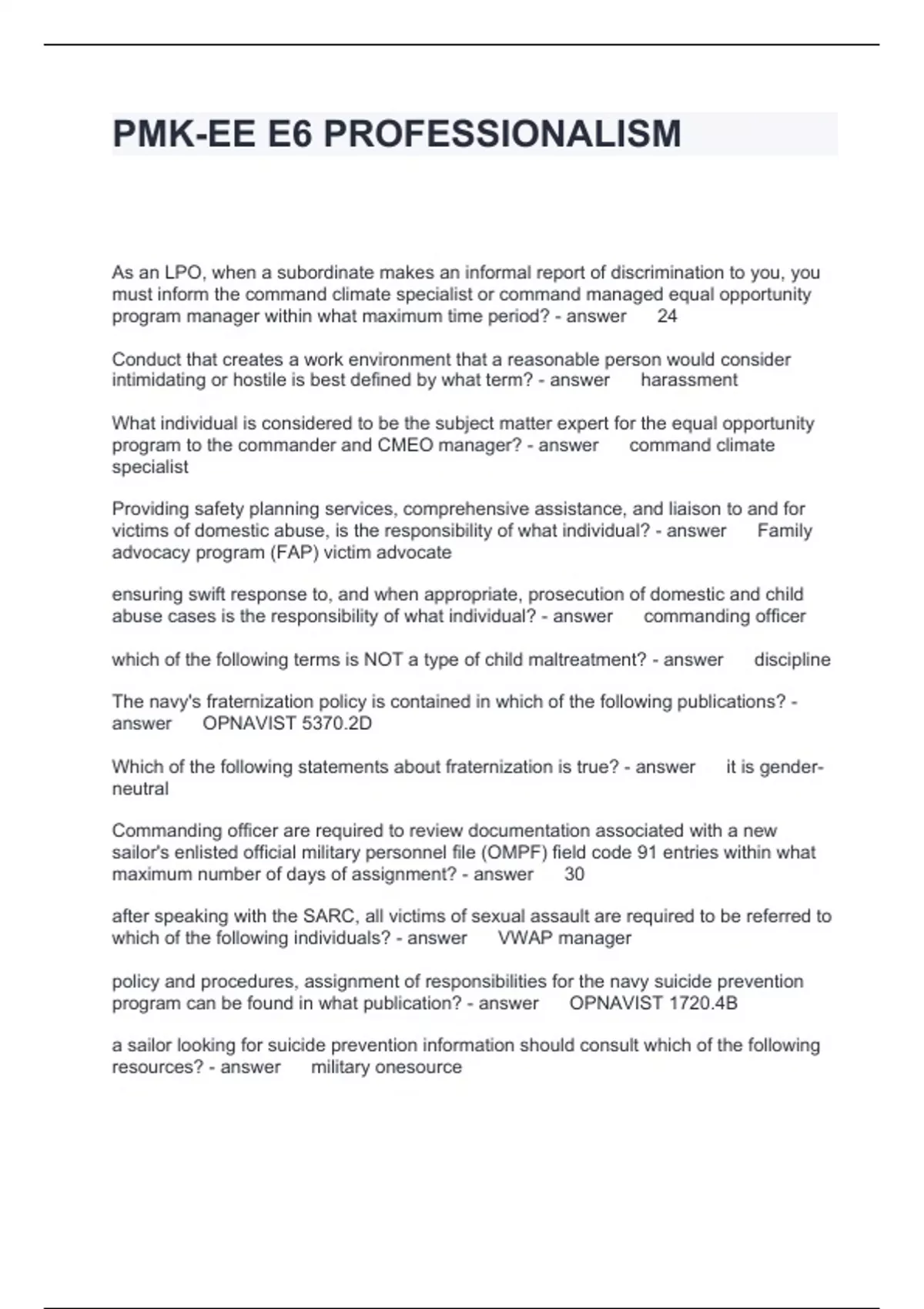 PMK-EE E6 PROFESSIONALISM QUESTIONS AND ANSWERS 100% CORRECT