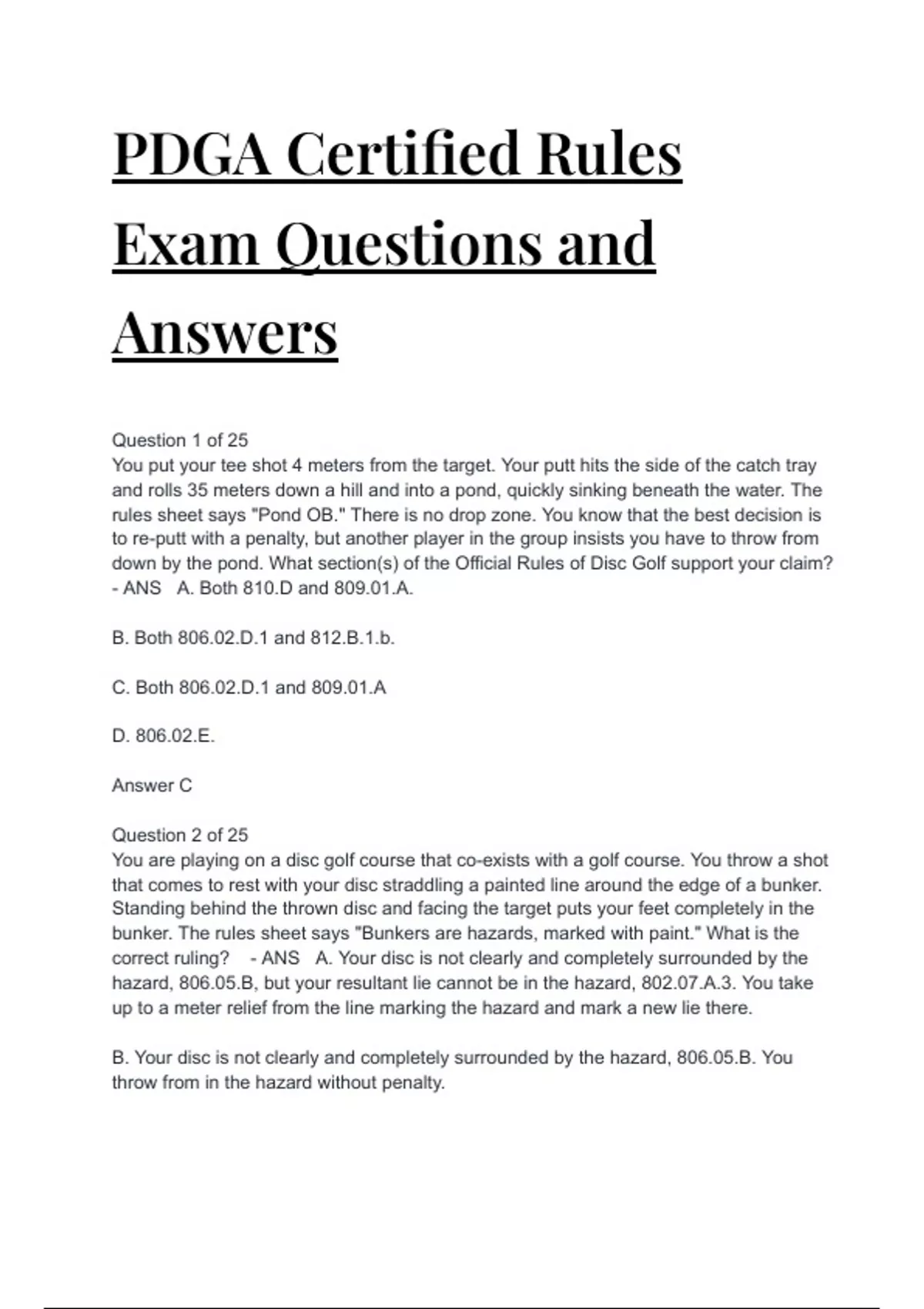 Question 1 of 25 You put your tee shot 4 meters from the target. Your putt hits the side of the catch tray and rolls 35 meters down a hill and into a pond, quickly sinking beneath the water. The rules sheet says "Pond OB." There is no drop zone. You know that the best decision is to re-putt with a penalty, but another player in the group insists you have to throw from down by the pond. What section(s) of the Official Rules of Disc Golf support your claim? - ANS A. Both 810.D and 809.01.A. B. Both 806.02.D.1 and 812.B.1.b. C. Both 806.02.D.1 and 809.01.A D. 806.02.E. Answer C Question 2 of 25 You are playing on a disc golf course that co-exists with a golf course. You throw a shot that comes to rest with your disc straddling a painted line around the edge of a bunker. Standing behind the thrown disc and facing the target puts your feet completely in the bunker. The rules sheet says "Bunkers are hazards, marked with paint." What is the correct ruling? - ANS A. Your disc is not clearly and completely surrounded by the hazard, 806.05.B, but your resultant lie cannot be in the hazard, 802.07.A.3. You take up to a meter relief from the line marking the hazard and mark a new lie there. B. Your disc is not clearly and completely surrounded by the hazard, 806.05.B. You throw from in the hazard without penalty. C. Your disc has broken the hazard plane, 806.05.B. You take a penalty throw and throw from in the hazard. D. Your disc has broken the hazard plane, 806.05.B. You take a penalty throw but get free optional relief back along the line of play. Answer C Question 3 of 25 Your group has thrown their drives on a hole where the fairway is short and straightforward, but the target is placed on a 1.5m tall man-made mound covered in artificial turf. All four of you are within the putting circle. The away player putts, and their disc hits the catch tray, rolls, and is stopped by the player's own bag. Another player in the group calls an interference penalty and looks over to you. Should you second the call? - ANS A. No, a disc that strikes something that isn't part of the course is played where it first comes to rest, 810.C. B. Yes, this is cheating and the player should be disqualified, Competition Manual 3.03.C.1. C. No, any interference with a player's own disc must be intentional, 810.E. D. Yes, this is interference, 810.D. Answer D Question 4 of 25 A player in your group throws their second shot past the target and into thick, deep rough. There's a white paint line between the cut grass of the fairway and the rough. The rules sheet says "white paint lines mark OB rough." The disc is nowhere to be found. The whole group agrees that the disc clearly landed in the OB area. What next? - ANS A. Because not being able to find your disc is punishment enough, the player marks a new lie within a meter of where the disc was last seen with no penalty. B. Because the group cannot locate the disc within three minutes, it is declared lost, 805.03.A. The player receives a penalty throw and must throw from their previous lie, 805.03.D. C. Because the group agrees that the disc landed OB, it is OB, 806.02.A. However, because the group cannot locate the disc within three minutes, it is declared lost, 805.03.A. The player takes two penalty strokes and returns to their previous lie. D. Because the group agrees that the disc landed OB, it is not a lost disc, 806.02.C. The group determines the point where the disc went out, and the player receives a penalty stroke and can play from an in-bounds lie placed within a meter of that point in any direction, 806.02.D. Answer D. Question 5 of 25 Your group walks up to a hole that is a blind, downhill, right to left shot. You are teeing first. You throw a left-handed forehand shot that looks good, and your card yells when you hear the disc hit metal. When you get down to the target, your disc is stuck in the front of the target's tray. Did you complete the hole? - ANS A. Yes. Your disc came to rest supported by the tray, 807.B. B. Yes. No one saw the disc enter the target incorrectly, 807.B. C. No. Your disc needed to enter the target between the bottom of the chain support and the top of the catch tray, 807.C. D. No, because less than half the disc is inside the tray, 807.B. Answer A Question 6 of 25 Your disc lands completely inside a fenced-in area. The rules sheet says "inside fence is out-of-bounds." What section of the Official Rules of Disc Golf has the rule you need? - ANS A. 806, Regulated Areas. B. 802, Throwing. C. 811, Misplay. D. 803, Obstacles and Relief Answer A Question 7 of 25 Your drive lands in a creek about halfway to the target and immediately sinks to the bottom and stays put. The rules sheet says "creek is casual water." What section of the Official Rules of Disc Golf do you look at to figure out what to do next? - ANS A. 809, Other Throws. B. 803, Obstacles and Relief. C. 805, Regulated Positions. D. 806, Regulated Areas. Answer A Question 8 of 25 The last player to tee on your thirteenth hole of the round gets aggressive on their tee shot, which kicks into the woods. "I might want to abandon that throw," the player says, "but I will throw a provisional to save time so I don't have to walk back up here." Before anyone says anything, the player throws a second shot that flies cleanly down the fairway. When you walk down the fairway, the player's first drive actually kicked out to the middle of the fairway, but the second drive went all the way down to an OB creek. "OK, I'll take the first one," they say, and throw an approach that lands under the target, and tap in their putt. They report a score of 3 on the hole: drive, upshot, and putt. What is their accurate score? - ANS A. The player took a 4. In addition to their drive, upshot, and putt, their attempted provisional did not meet the criteria because neither a rule nor the status of the disc was in question, 809.02.B. They also did not announce an intent to abandon the throw, 809.01.A. Therefore, thei